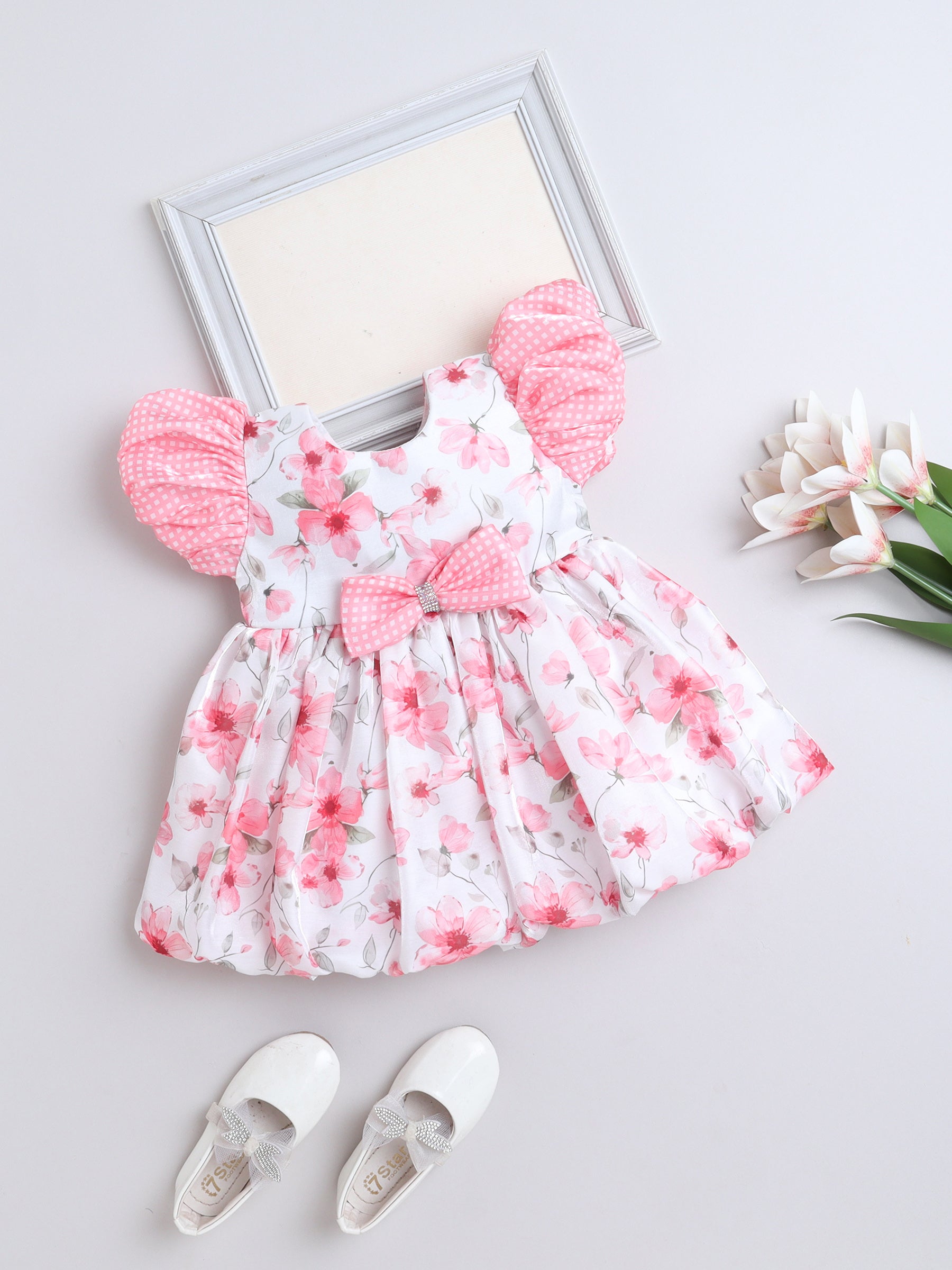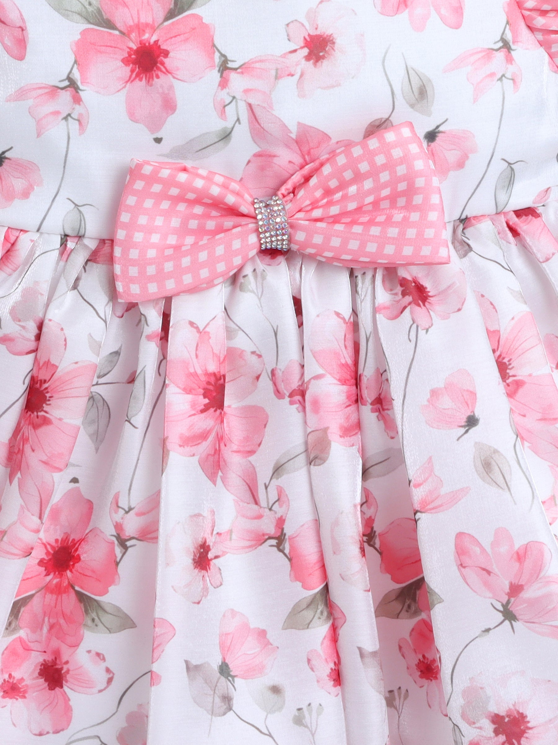 Half Sleeves Floral Printed Bow Applique Dress - Peach