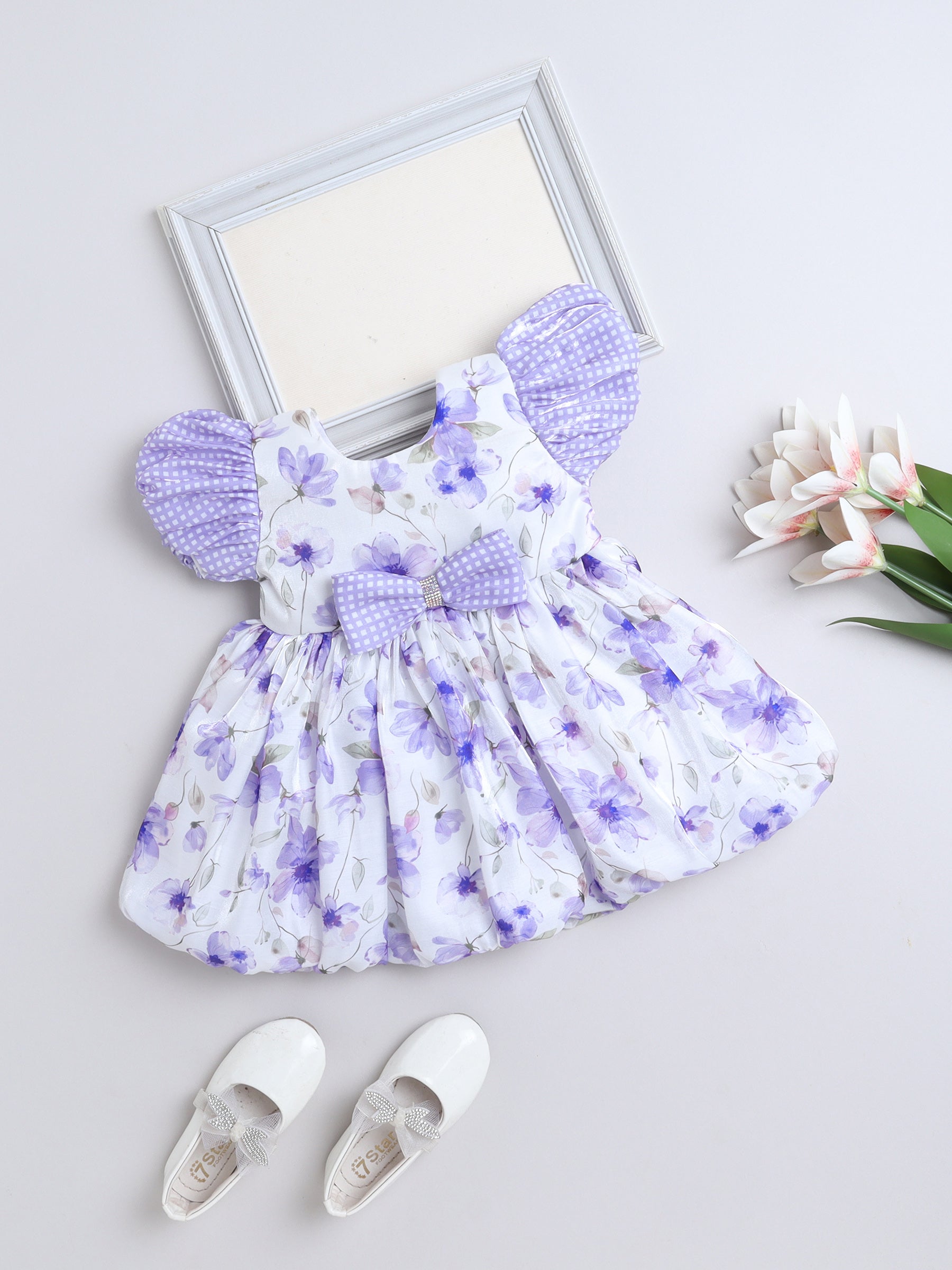 Half Sleeves Floral Printed Bow Applique Dress - Purple