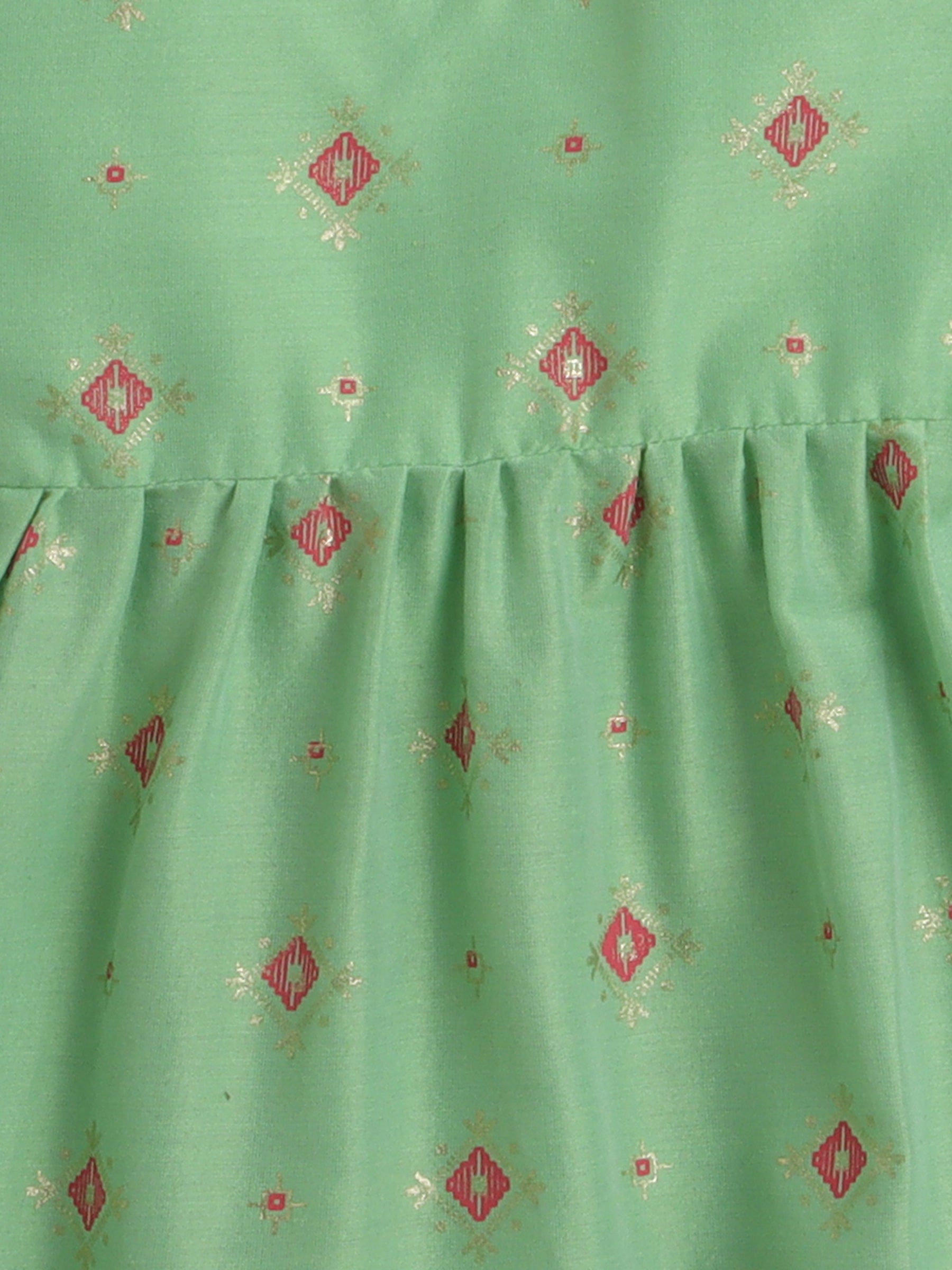 Halter Neck Foil Printed Tiered Dress For Girls With Contrast Net Frill Embelishment-Pista Green