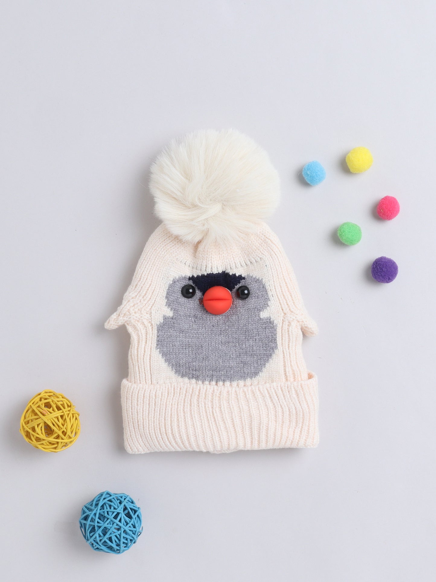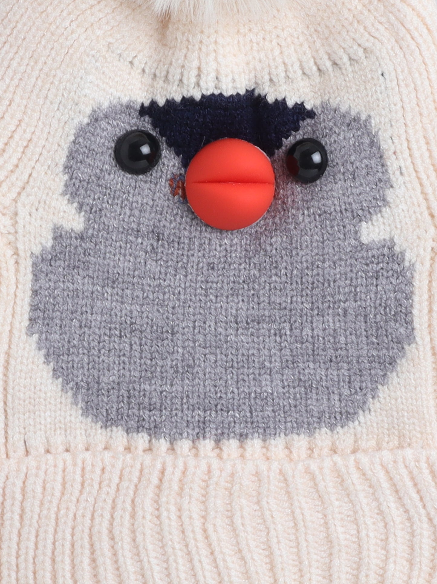 Kids Cute Penguin Design Woolen Cap With Pom Pom Beige