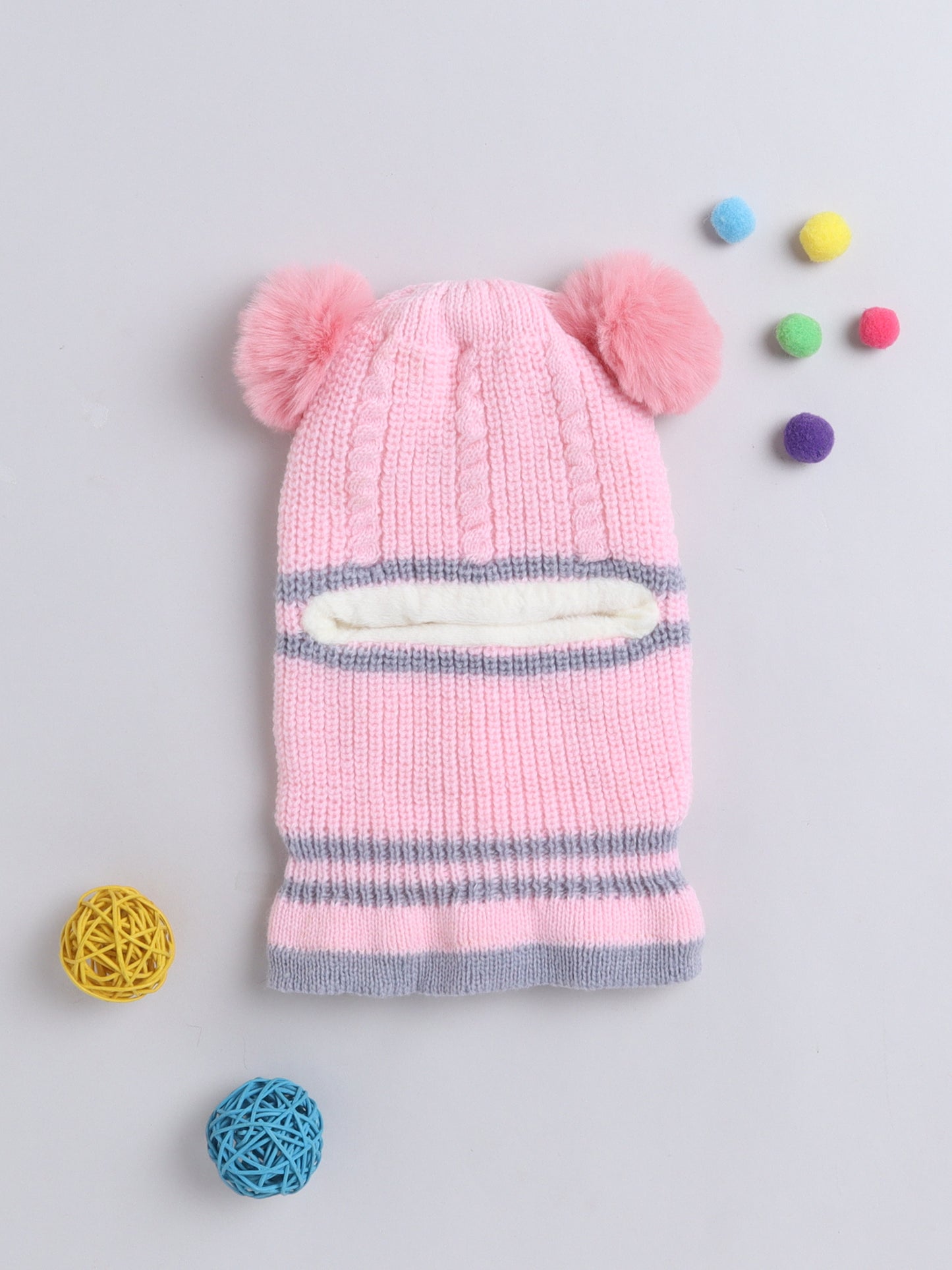 Kids Stipes Design Monkey Woolen Cap With Pom Pom Pink
