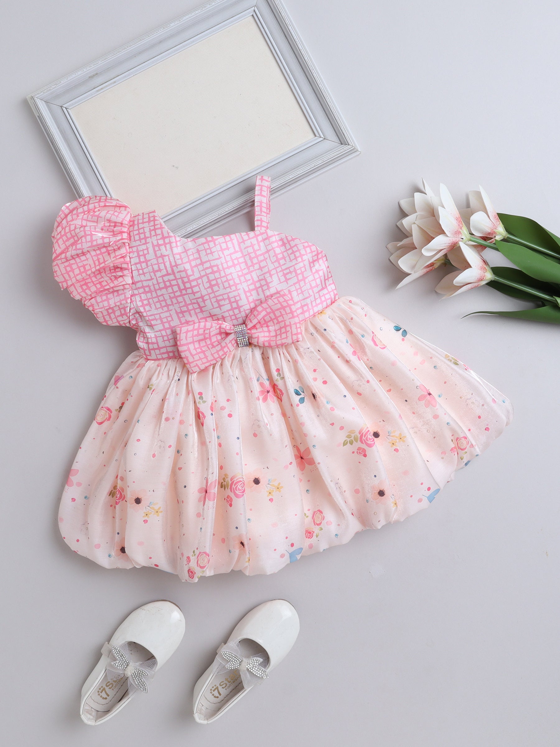 One Shoulder Bow Applique Floral Printed Dress - Peach