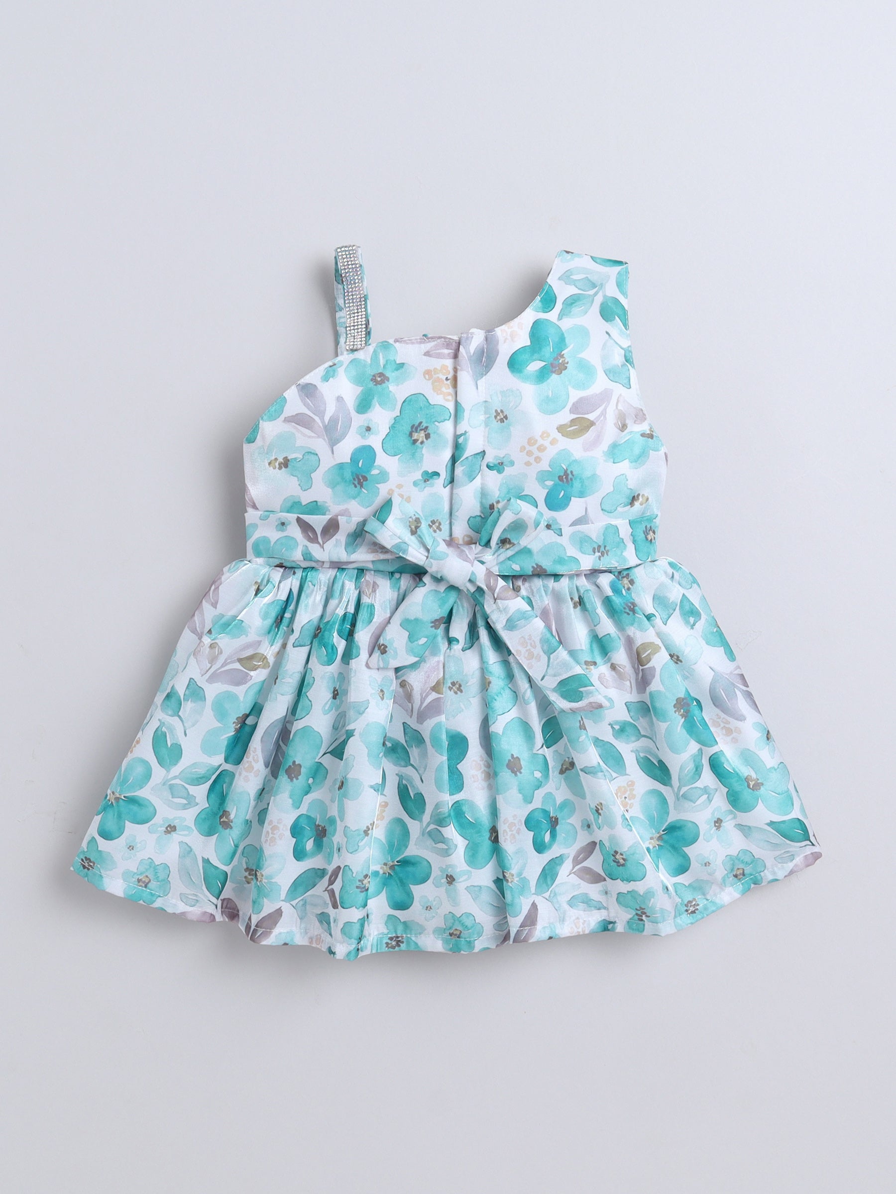 One Shoulder Floral Printed Bow Applique Dress - Teal Blue