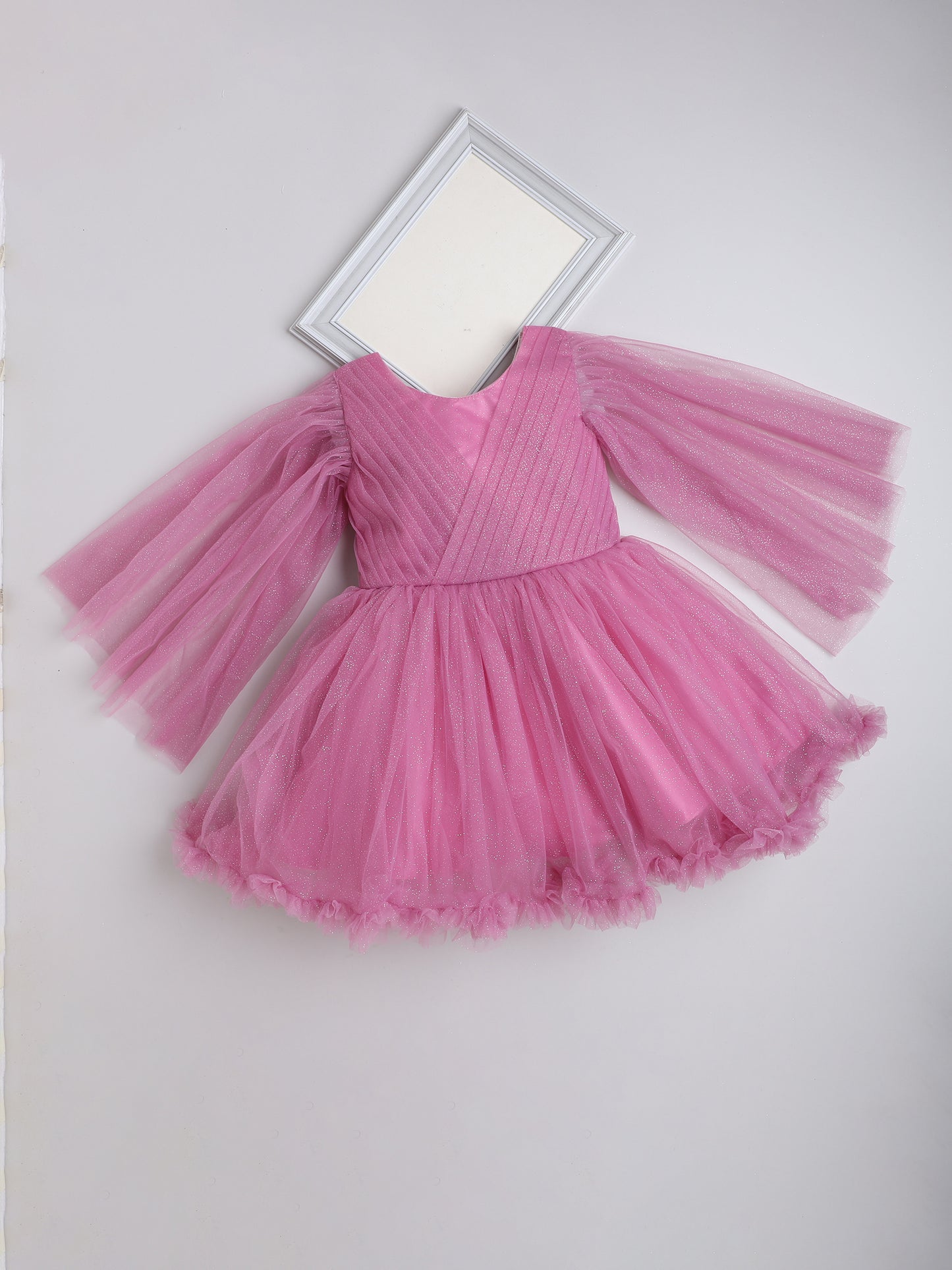 Ruffle Detailed Fit & Flare 3/4th Sleeves Party Dress For Girls- Onion Pink