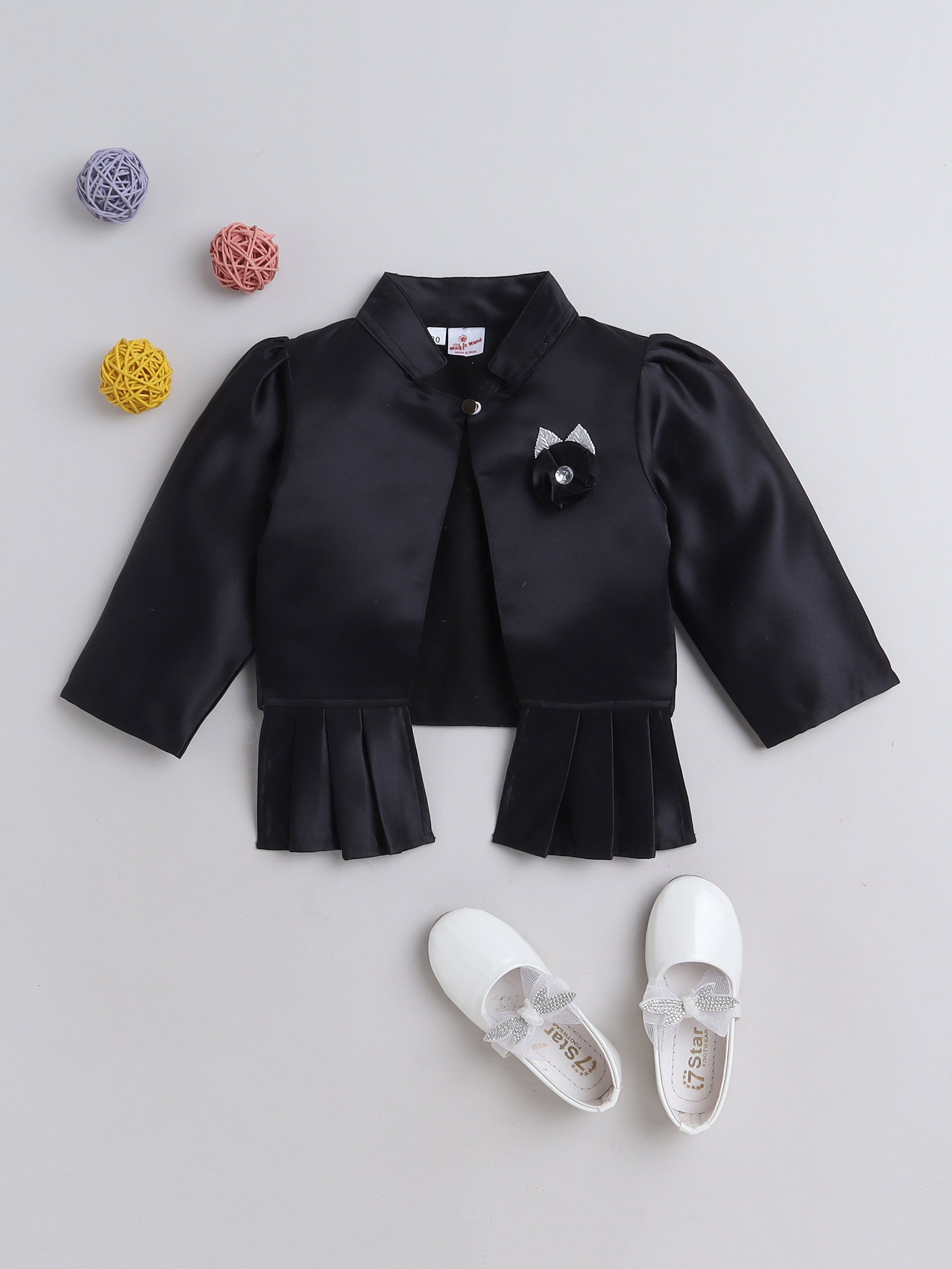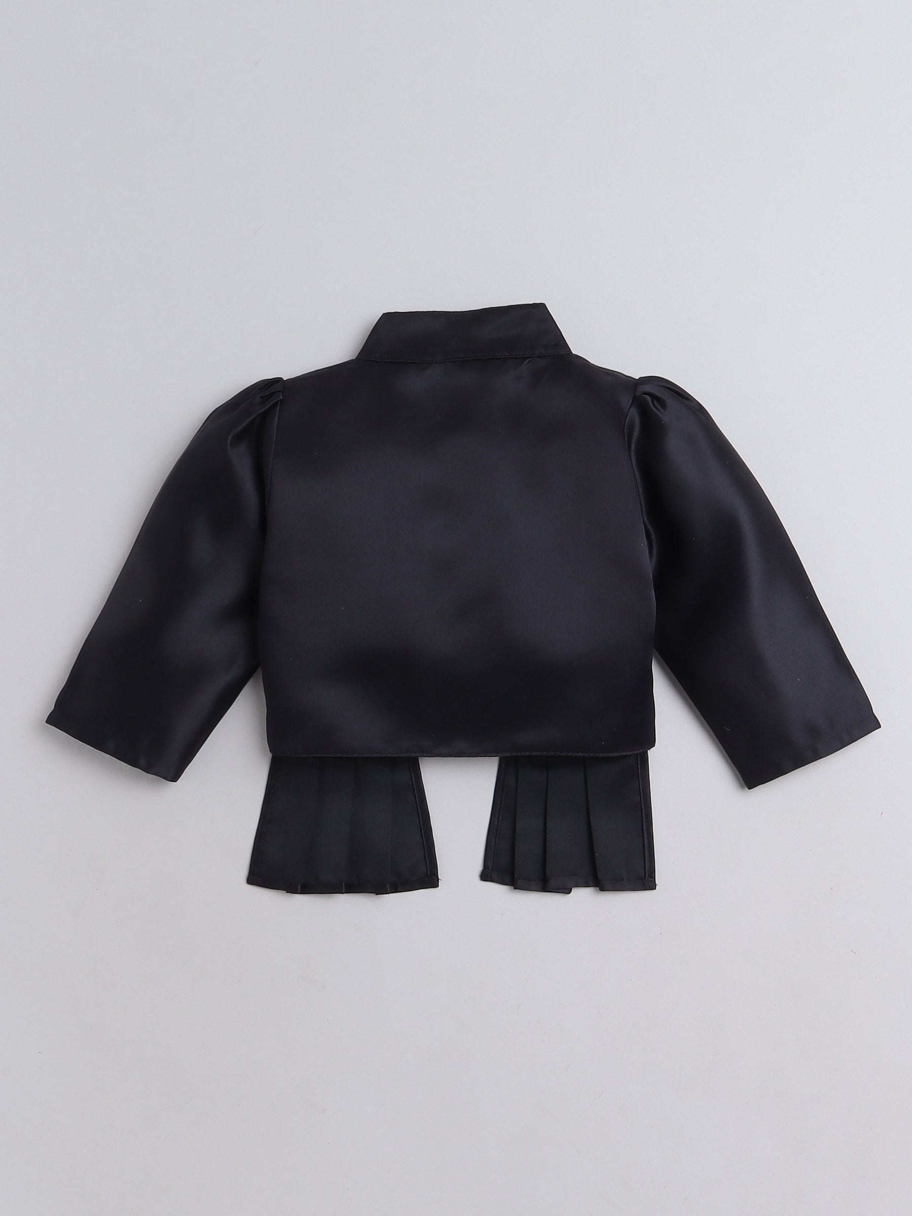 Satin Front Open Mandarin Collar Pleated Hem Three Fourth Sleeves Solid Shrug with Corsage For Girls Black