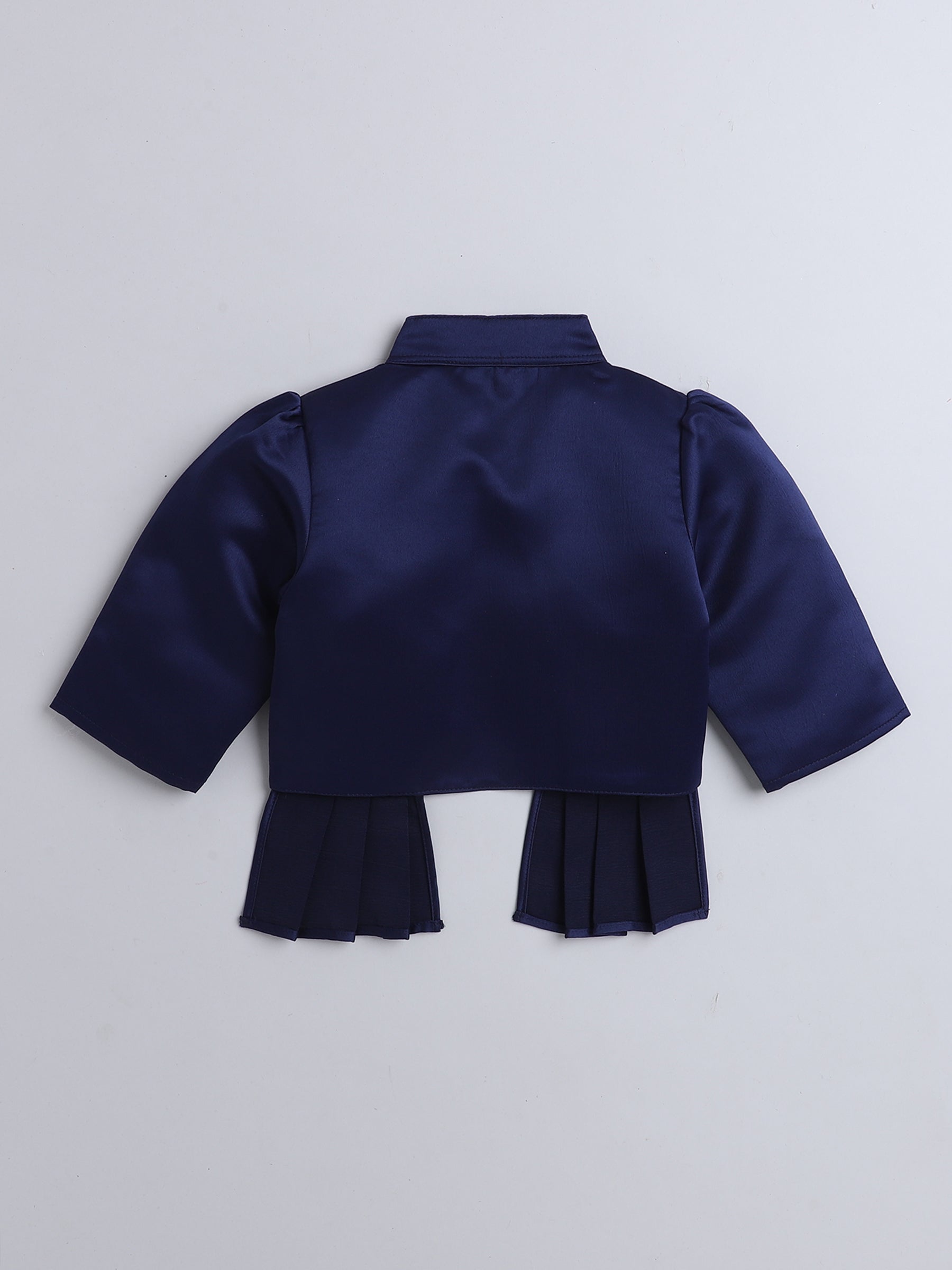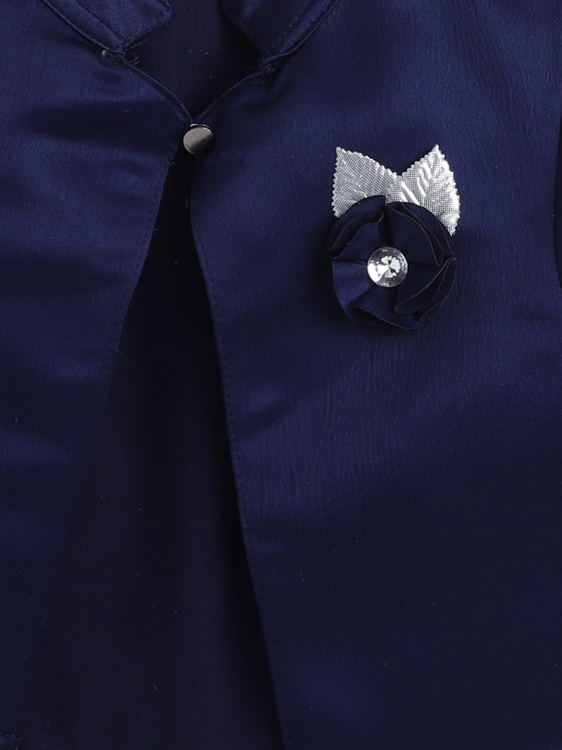 Satin Front Open Mandarin Collar Pleated Hem Three Fourth Sleeves Solid Shrug with Corsage For Girls Navy Blue