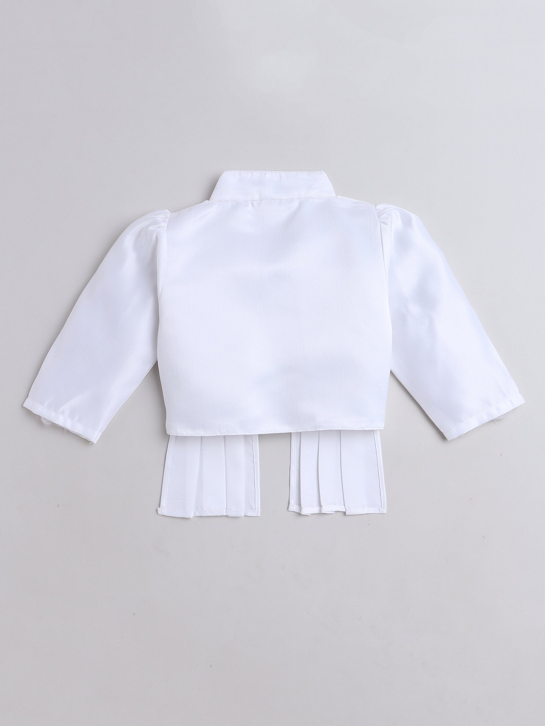 Satin Front Open Mandarin Collar Pleated Hem Three Fourth Sleeves Solid Shrug with Corsage For Girls White