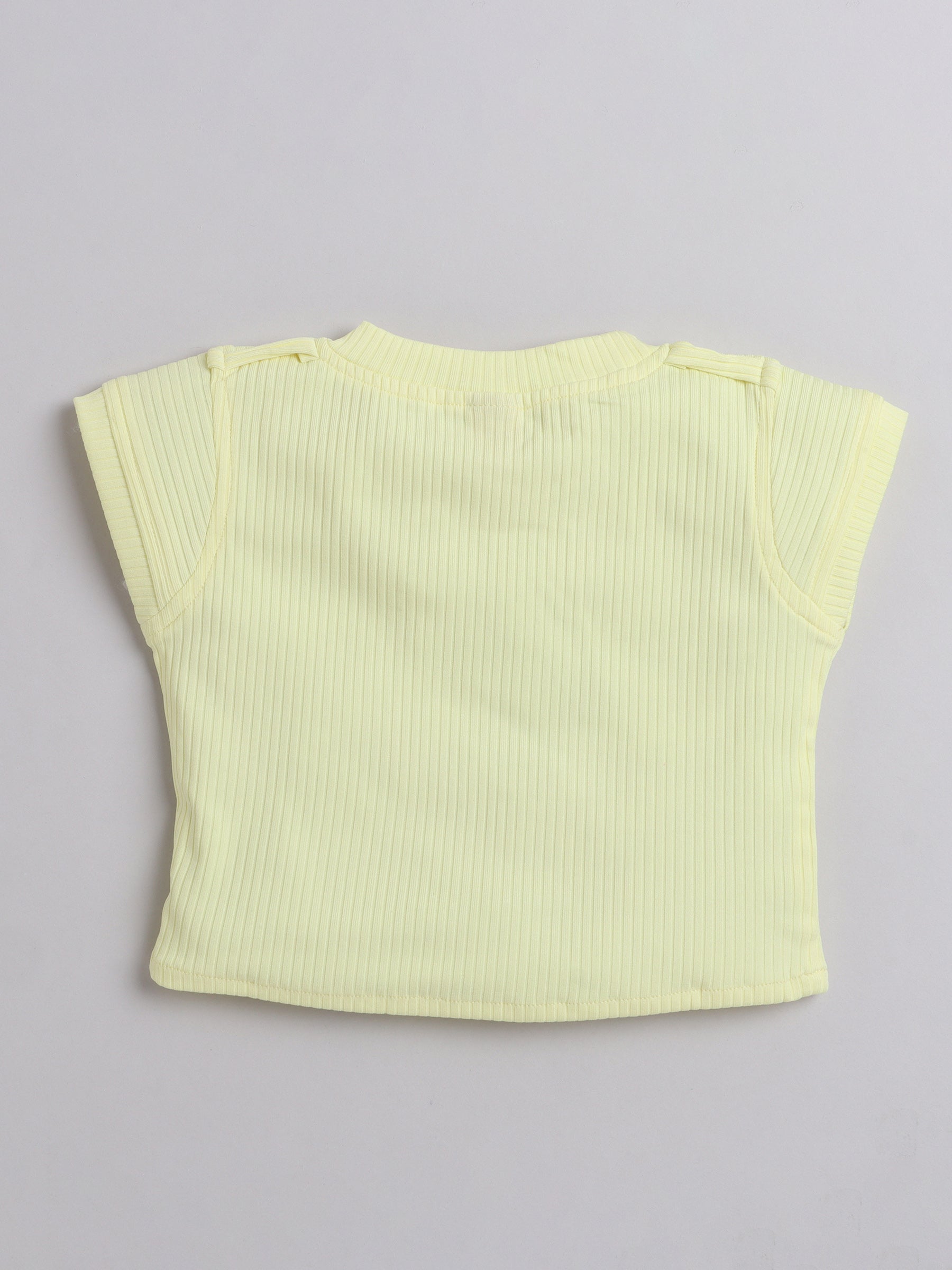 Short Sleeves Top With Floral Embroidered Denim Dungrees Set For Girls Yellow