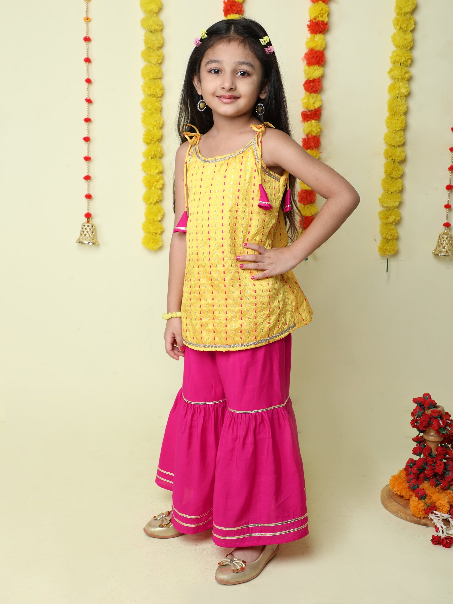 Sleeveless Abstract Foil Printed & Lace Embellished Kurta Sharara Set - Yellow