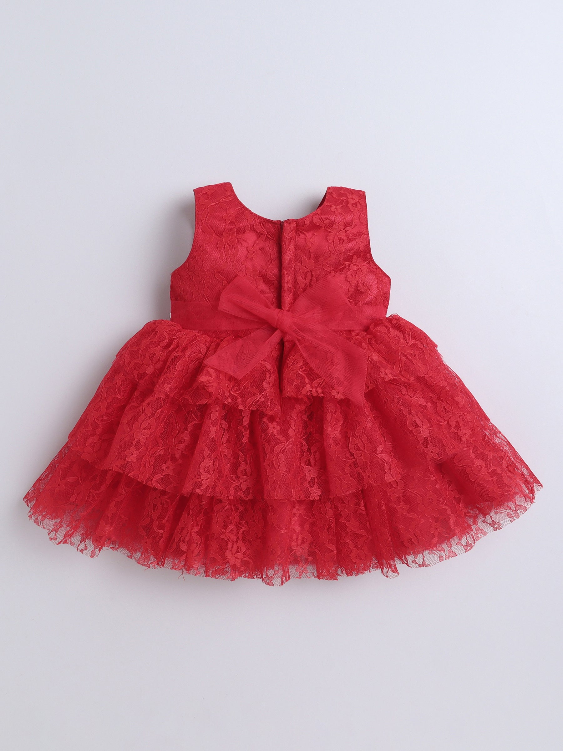 Sleeveless Floral Embroidered Sequins Embellished & Bow Applique Detailed Layered Dress - Red