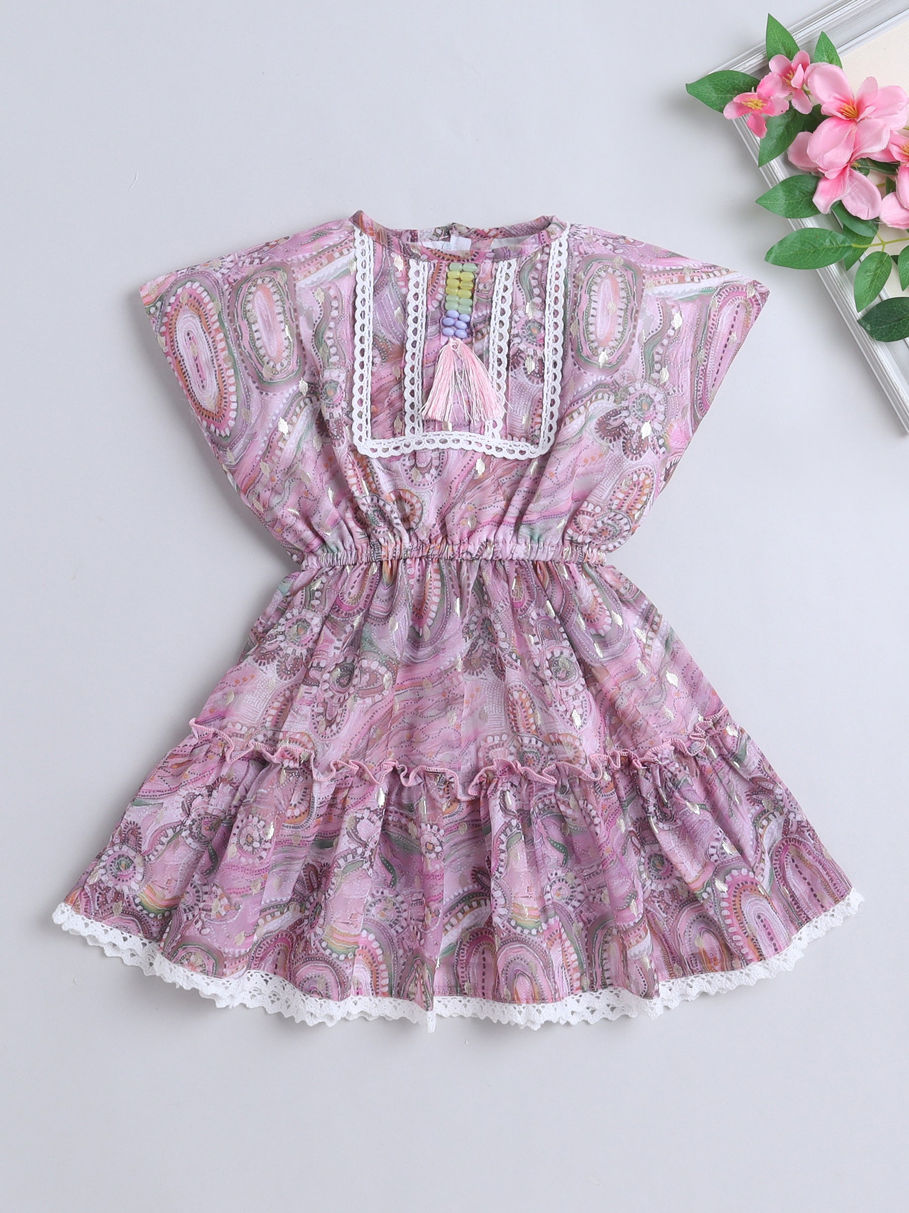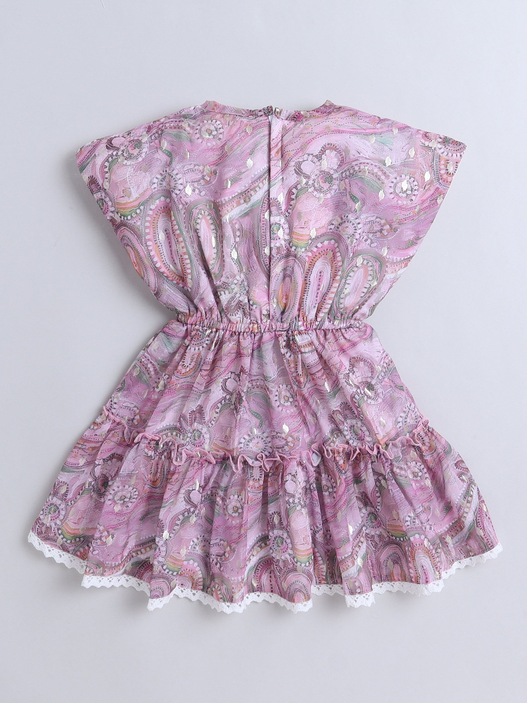 Sleeveless Floral Printed Lace Embellished Dress - Pink