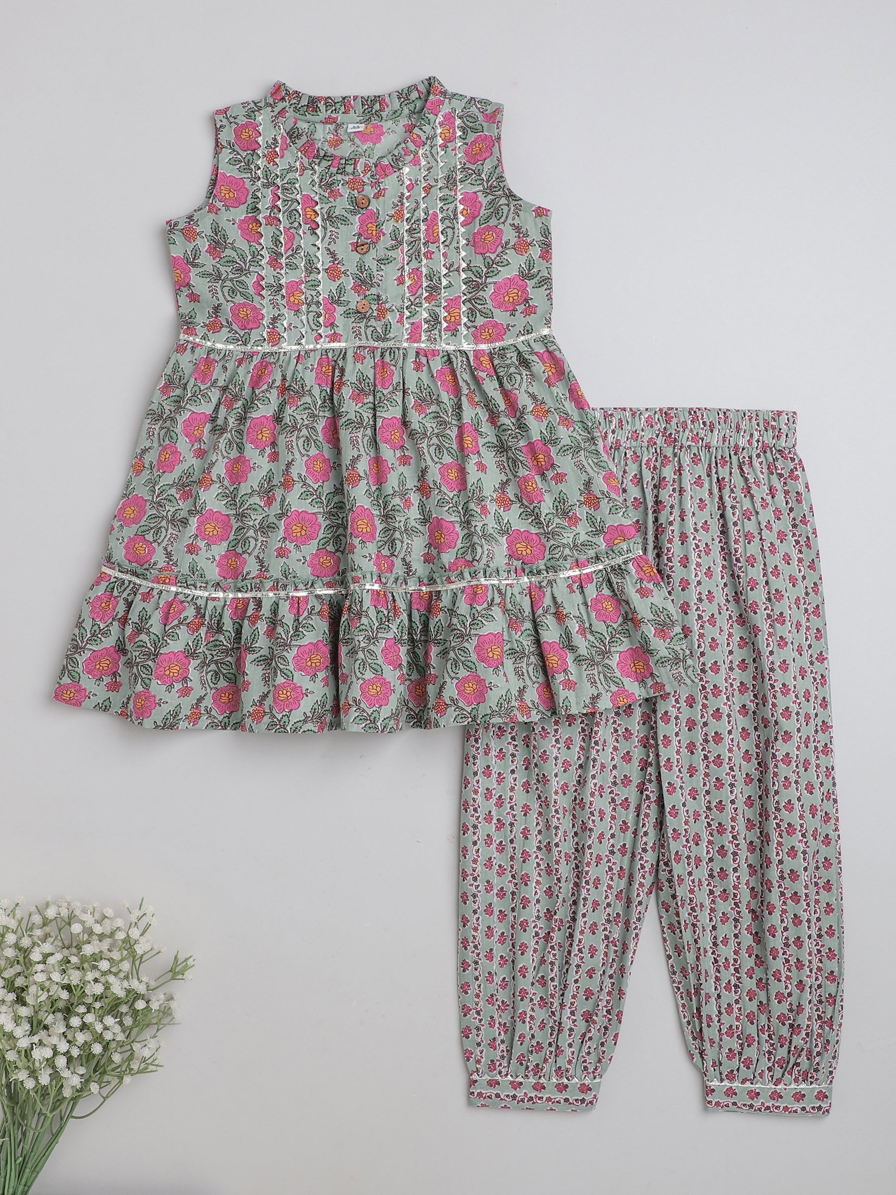 Sleeveless Floral Printed & Lace Embellished Gathered Top With Afghani Pants - Mint Green