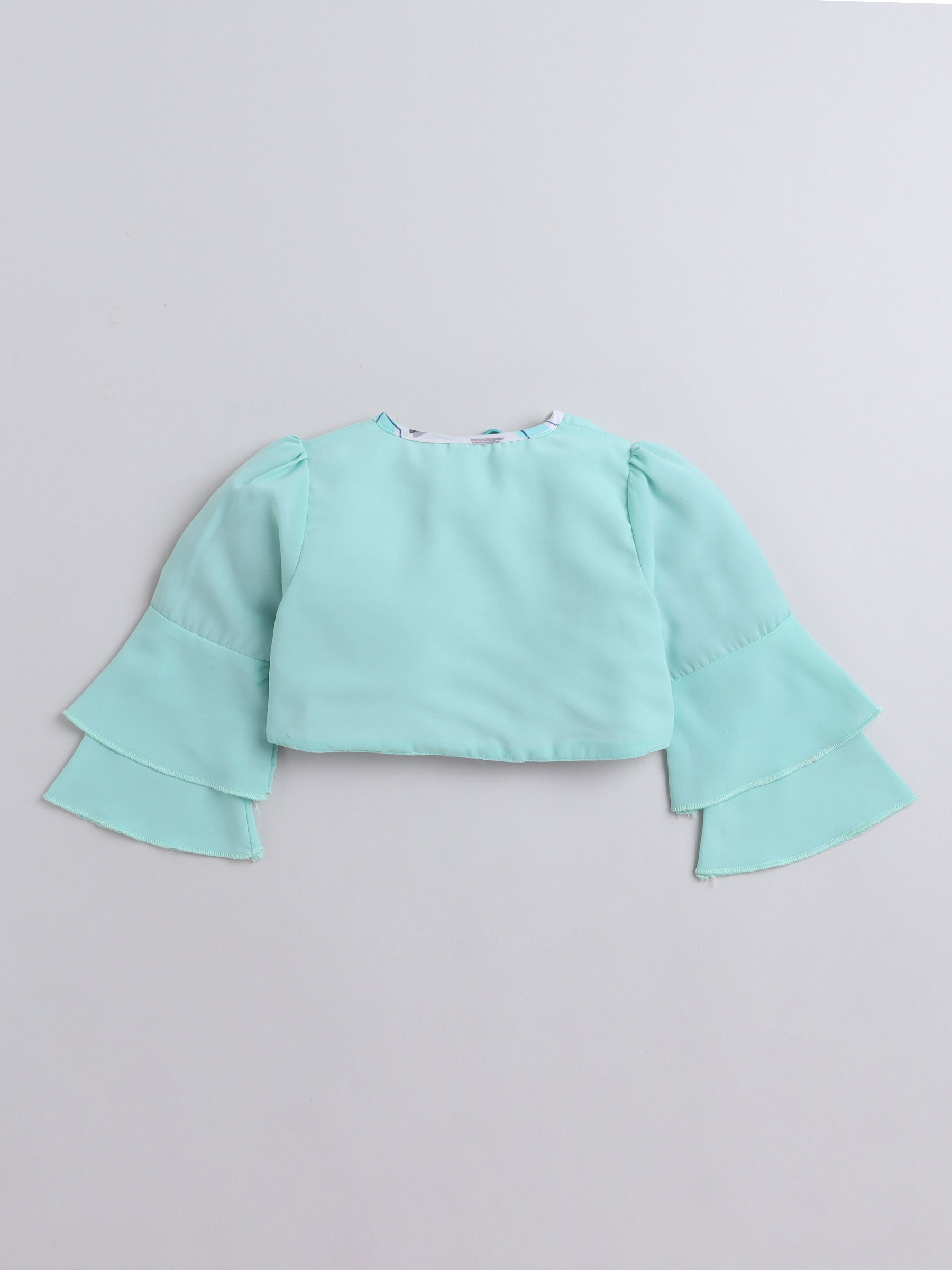 Sleeveless Floral Printed Tiered Dress With Full Sleeves Shrug With Corsage For Girls-Aqua