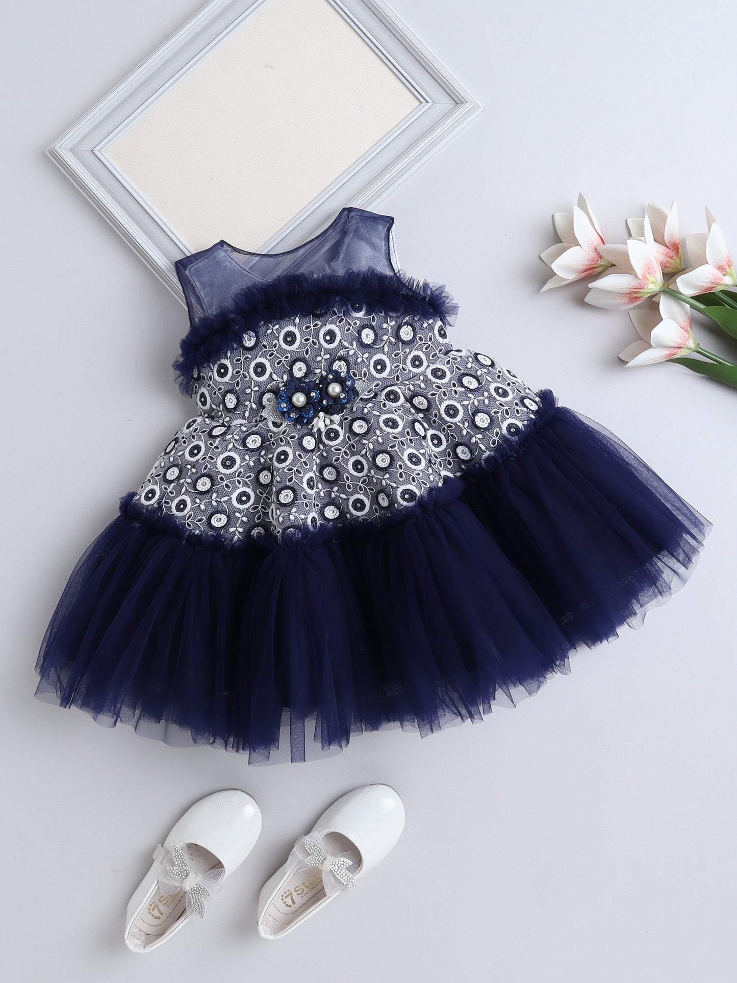 Sleeveless Flower Applique Net Dress For Girls - Blue