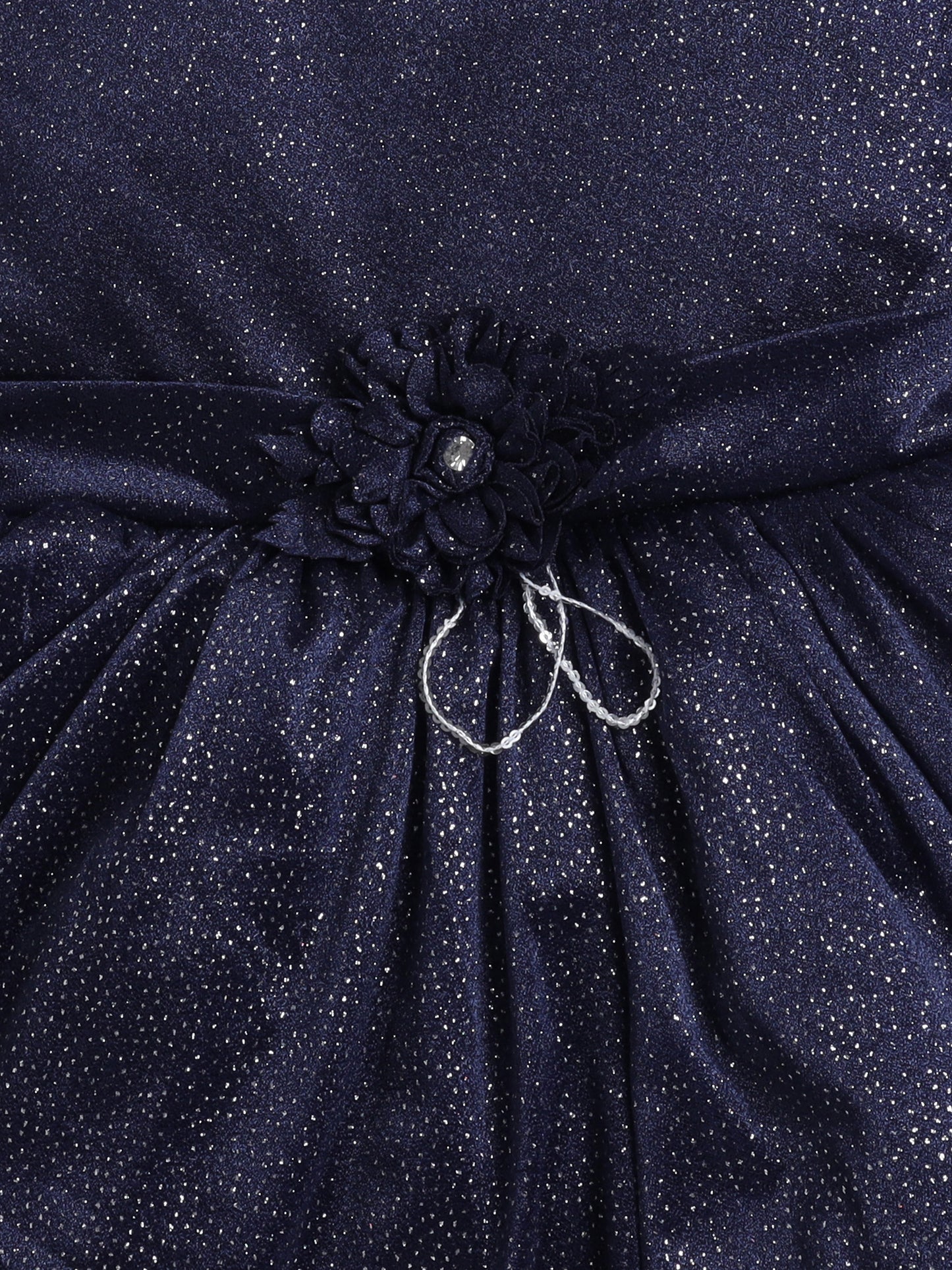 Sleeveless Shimmery Collar Neck Fit & Flare Party Dress With Corsage For Girls - Navy