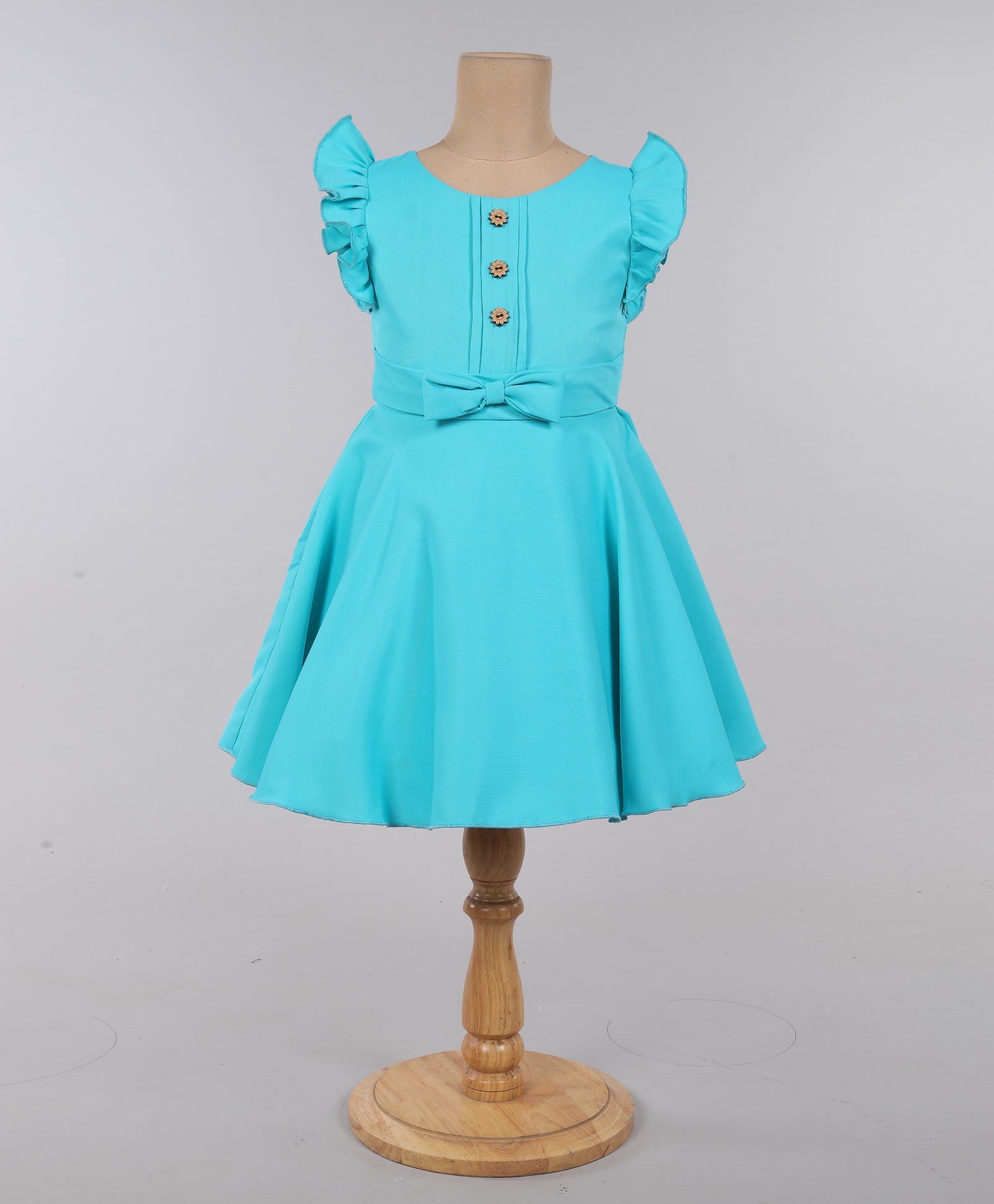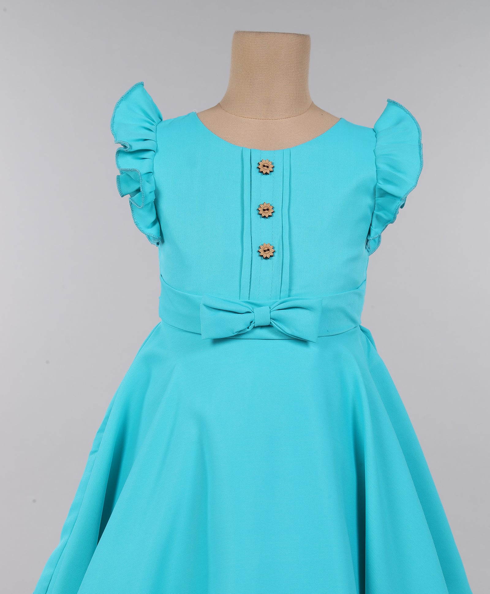 Solid Ruffel Dress With Bow For Girls-Sea Blue