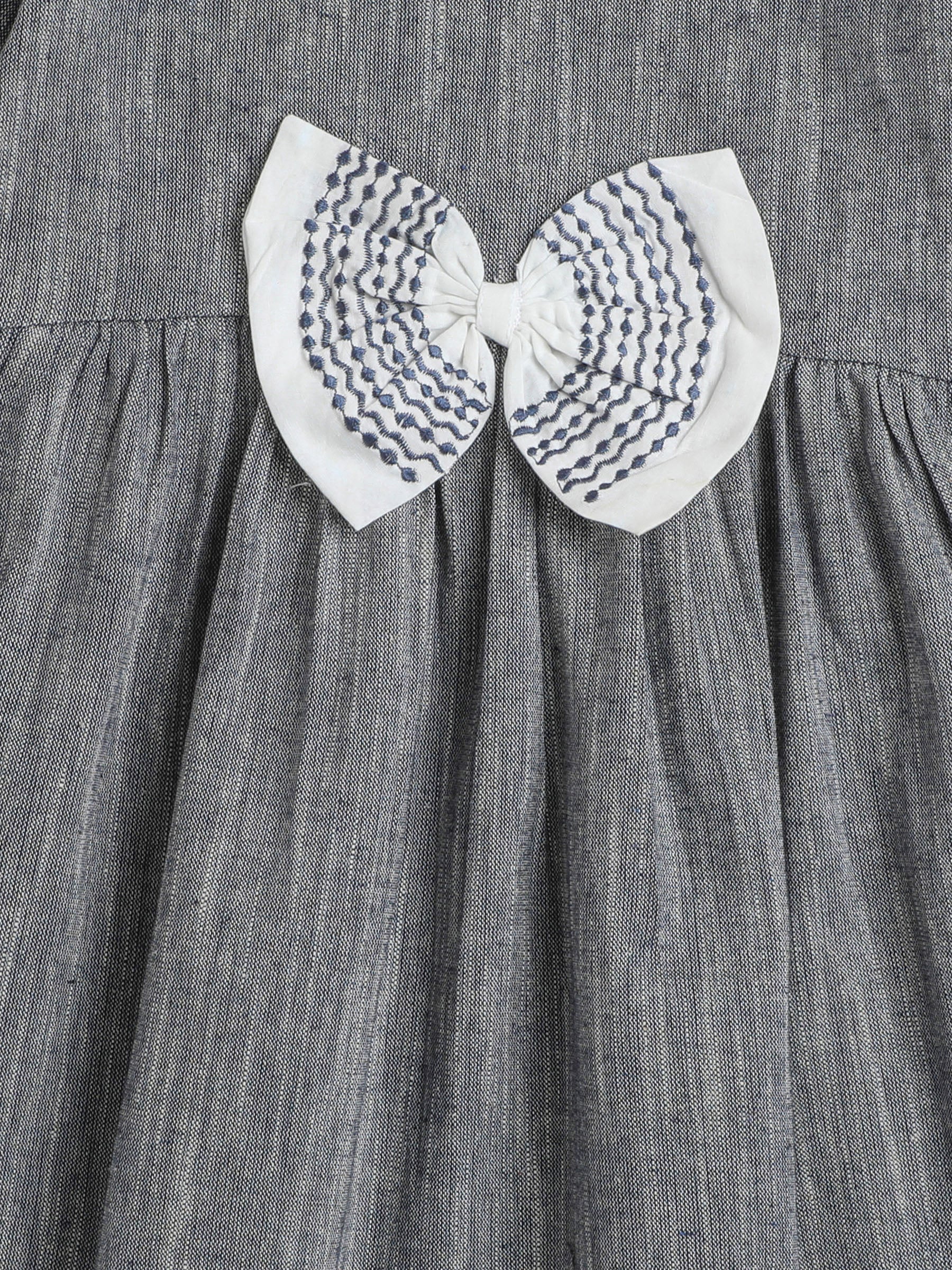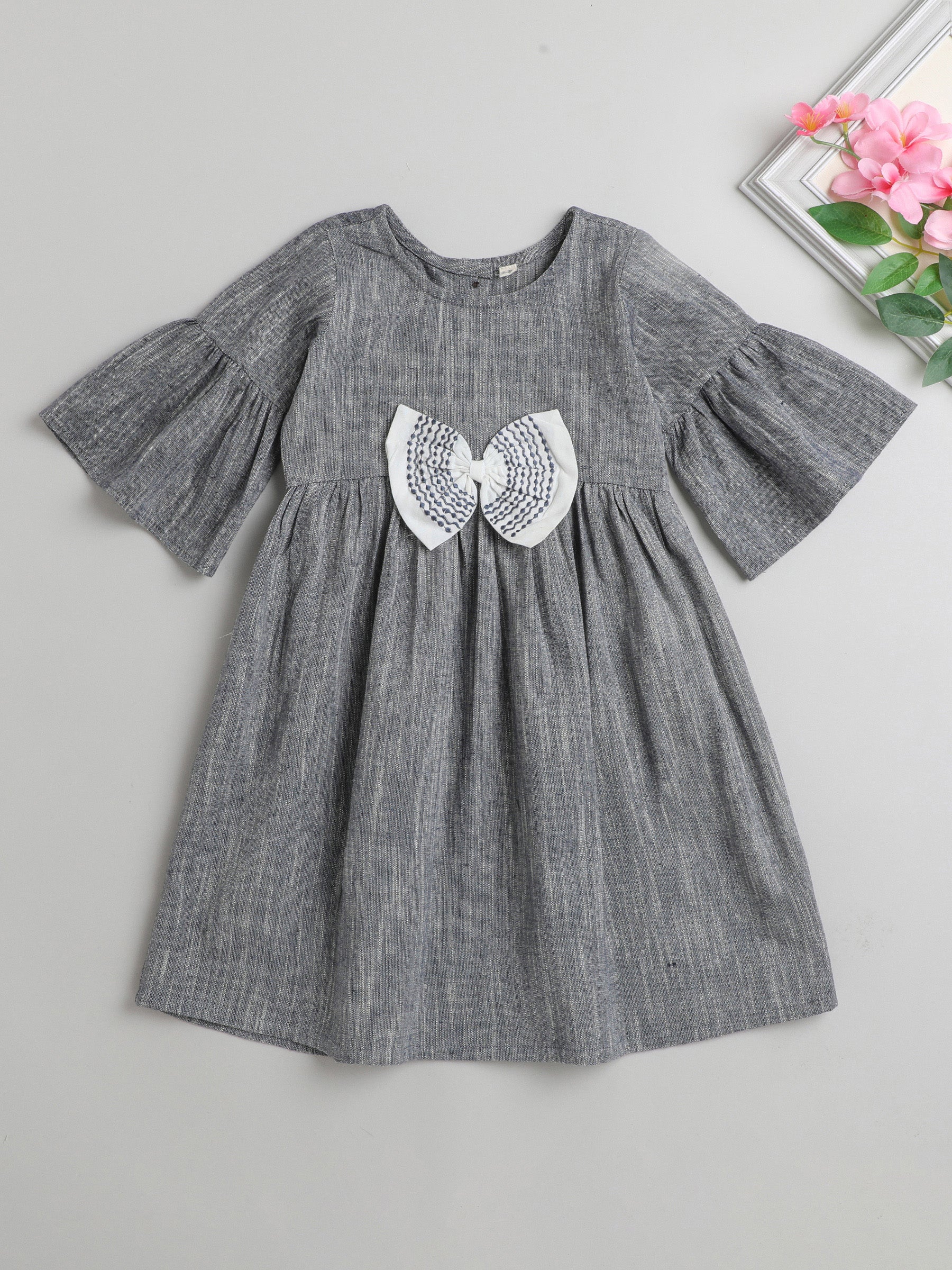Solid Short Frill Sleeves Emboriered Bow Detailing Dress For Girls- Grey