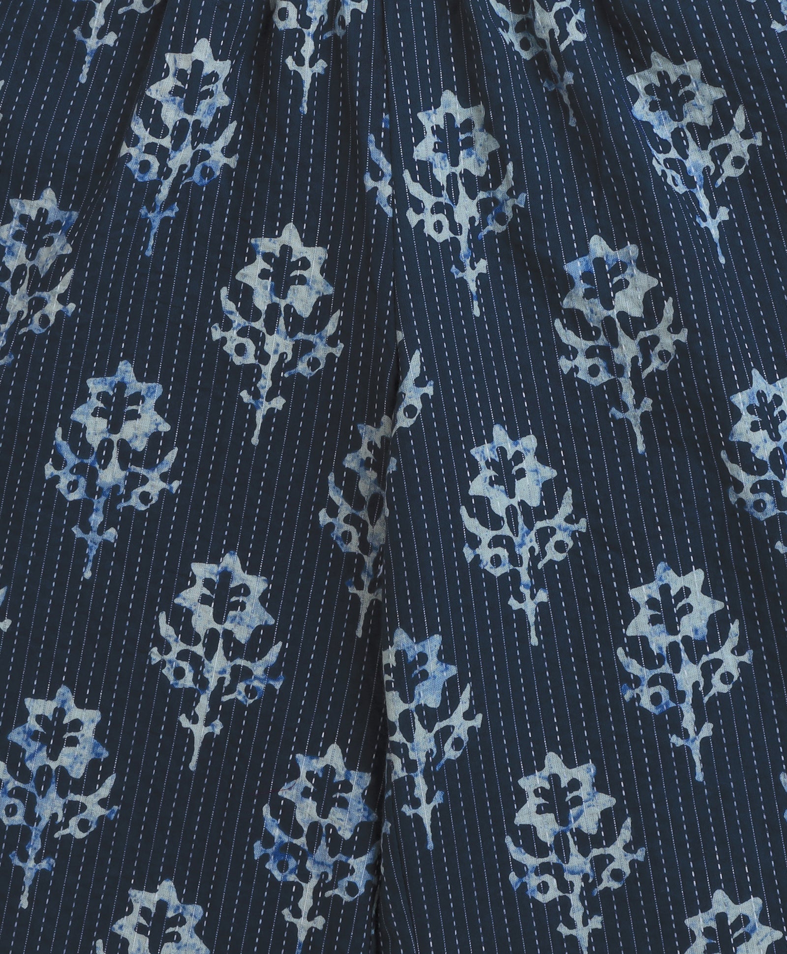 The Magic Wand Cambric Cotton Frill Sleeves Floral Printed Katha Work Top and Bottom Co-ord Set- Navy Blue