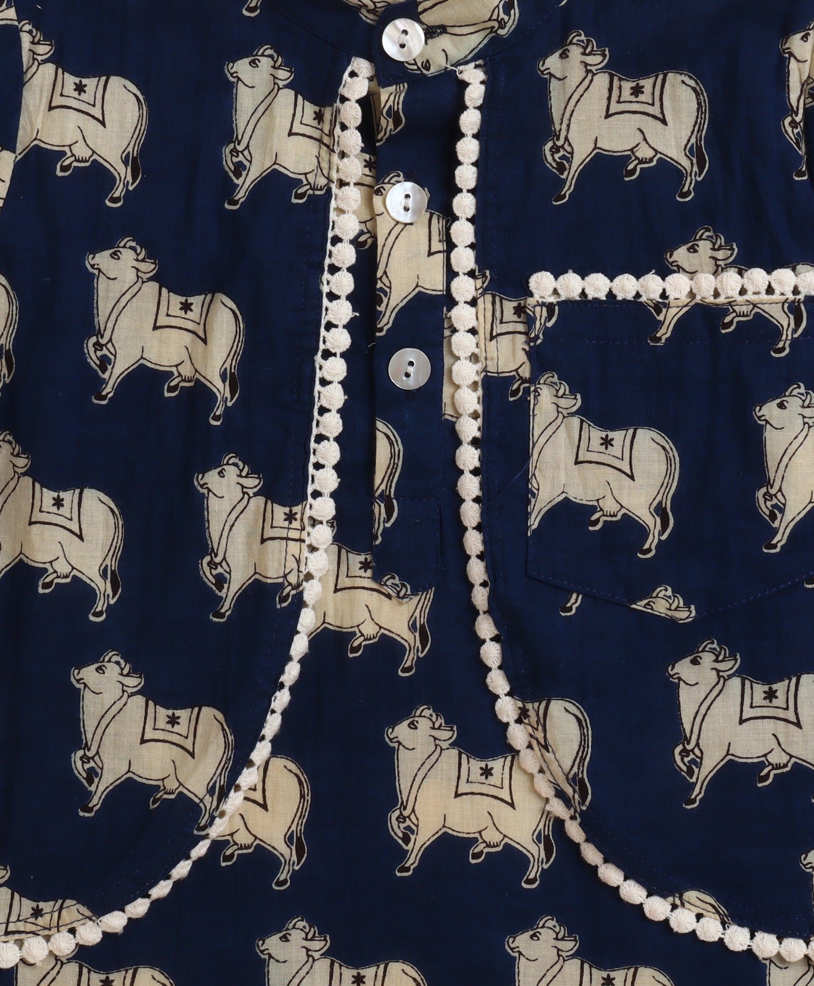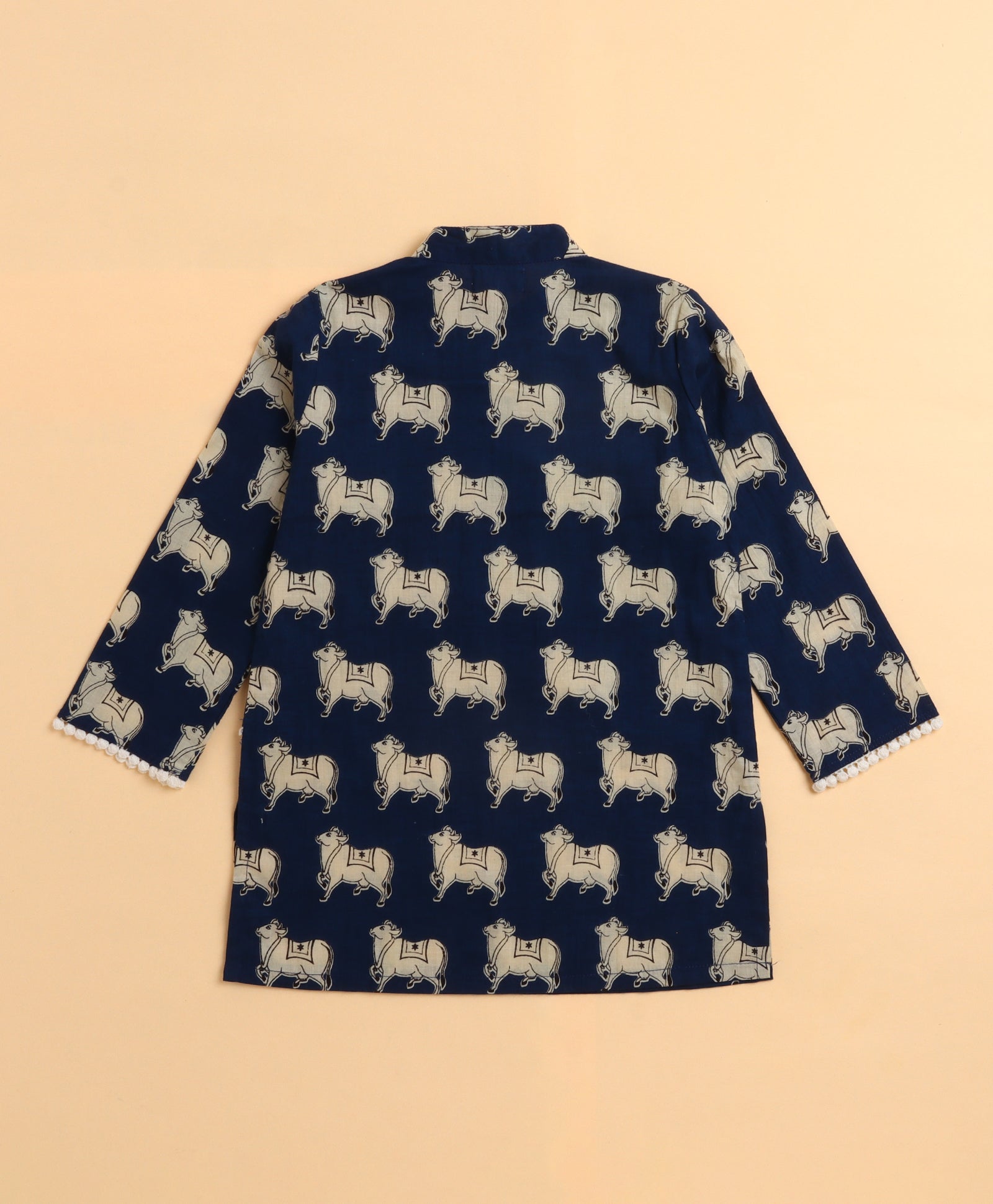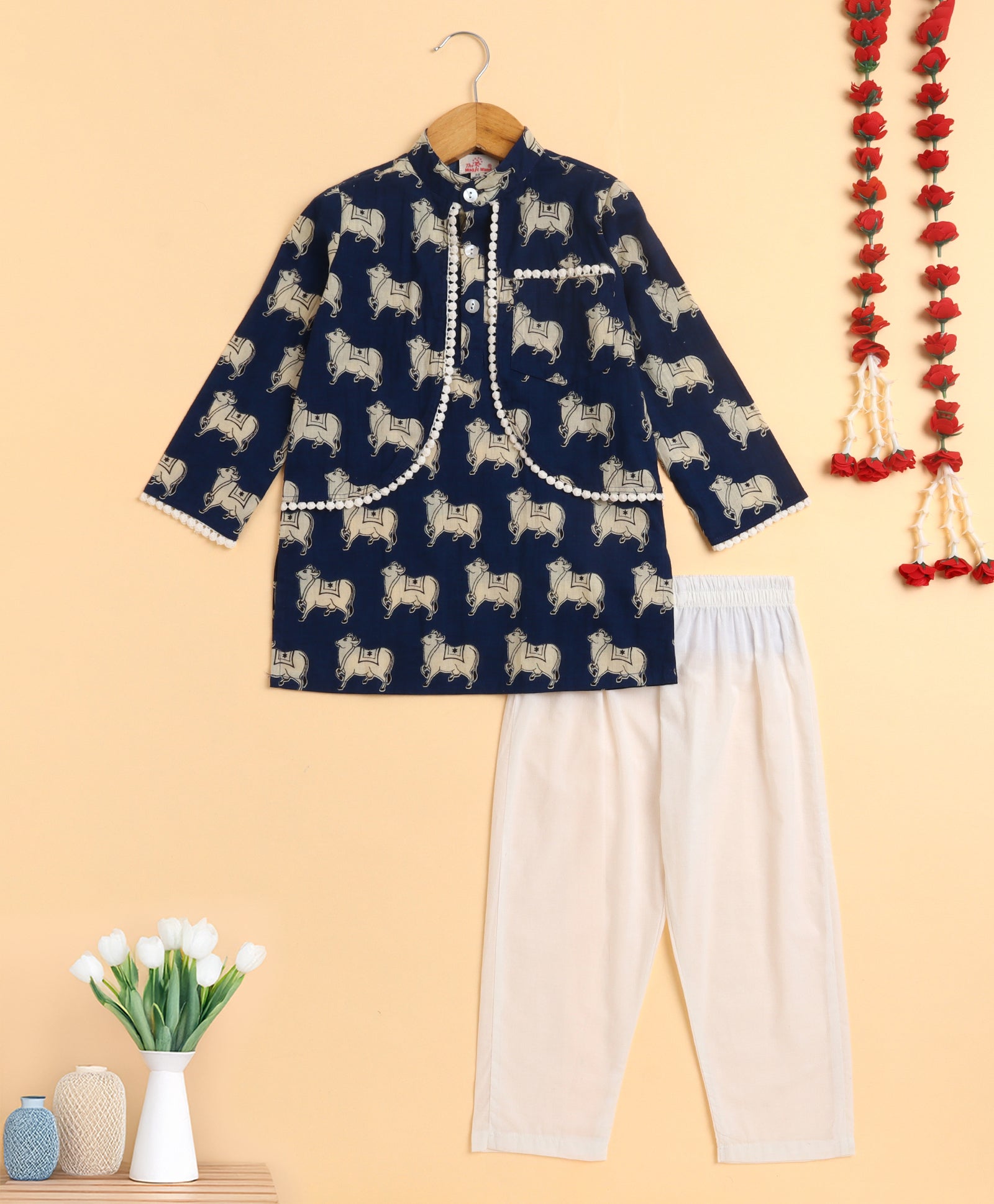 The Magic Wand Cambric Cotton Full Sleeves Cow Printed Attached Jacket Kurta and Pyjama Set- Navy Blue