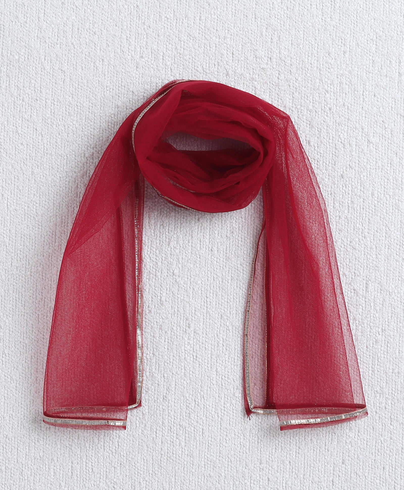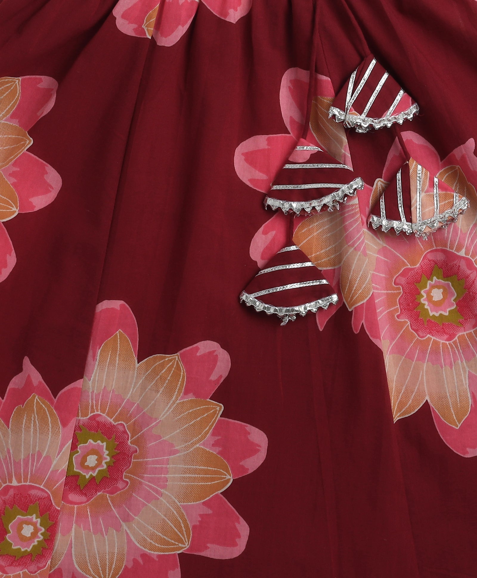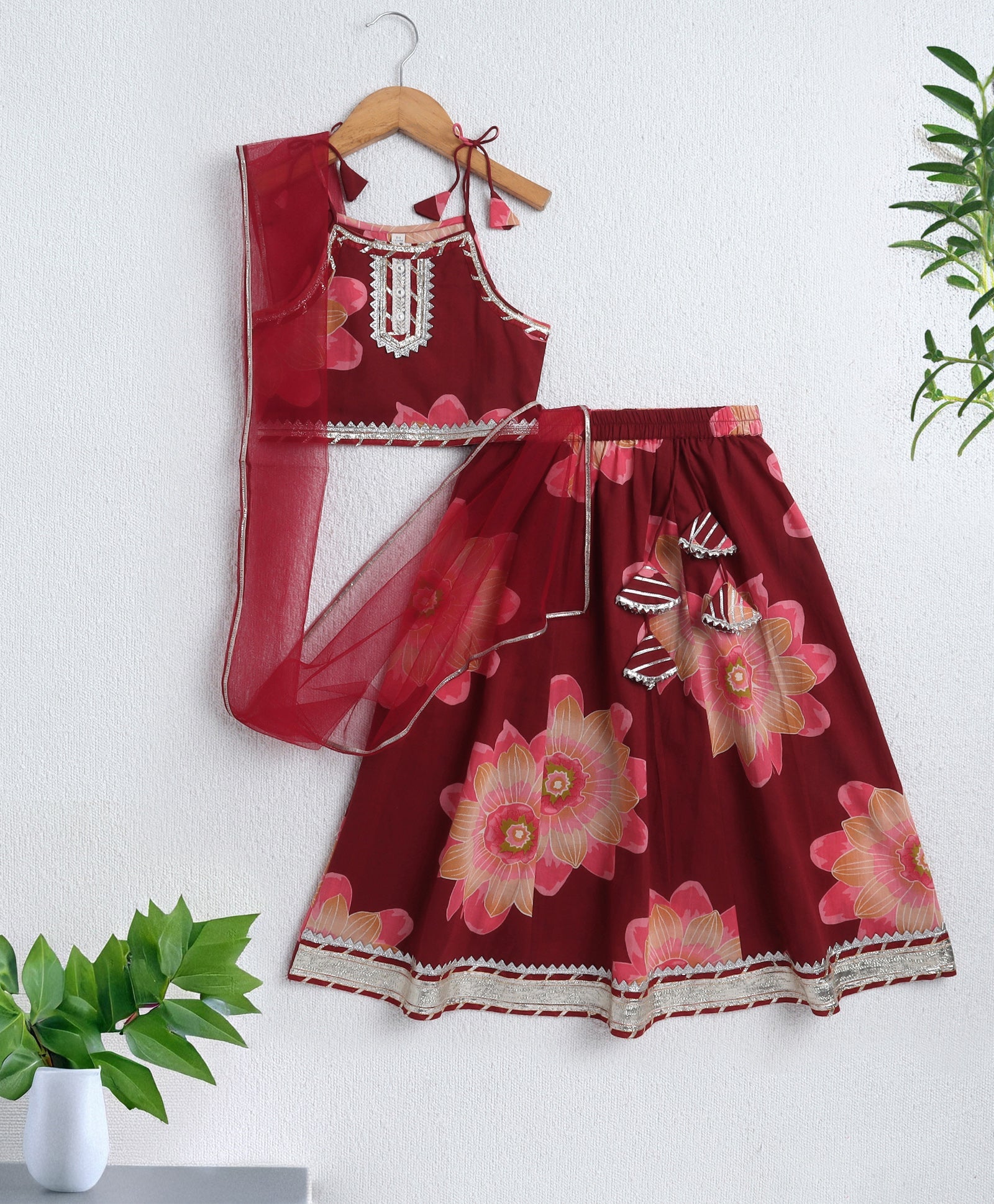 The Magic Wand Cambric Cotton Shoulder Tie up Floral Printed Lace Detailing Choli and Lehenga with Dupatta Set- Maroon