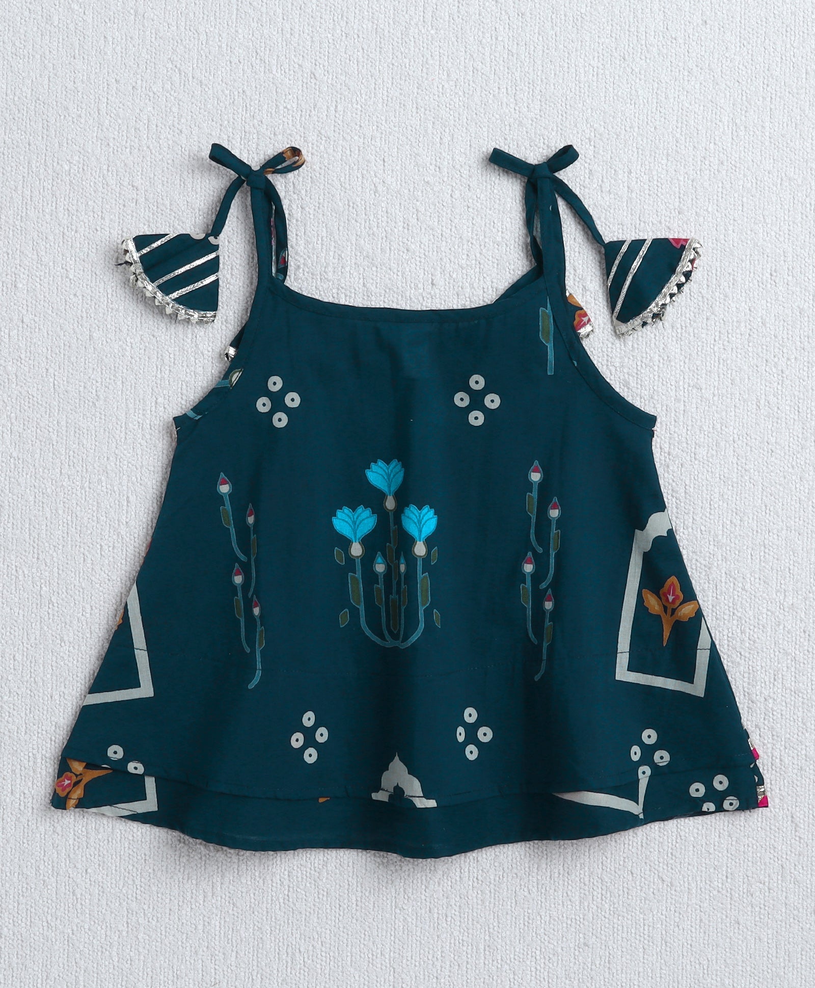 The Magic Wand Cambric Cotton Shoulder Tie Ups Printed Tent Top and Dhoti Set- Navy Blue