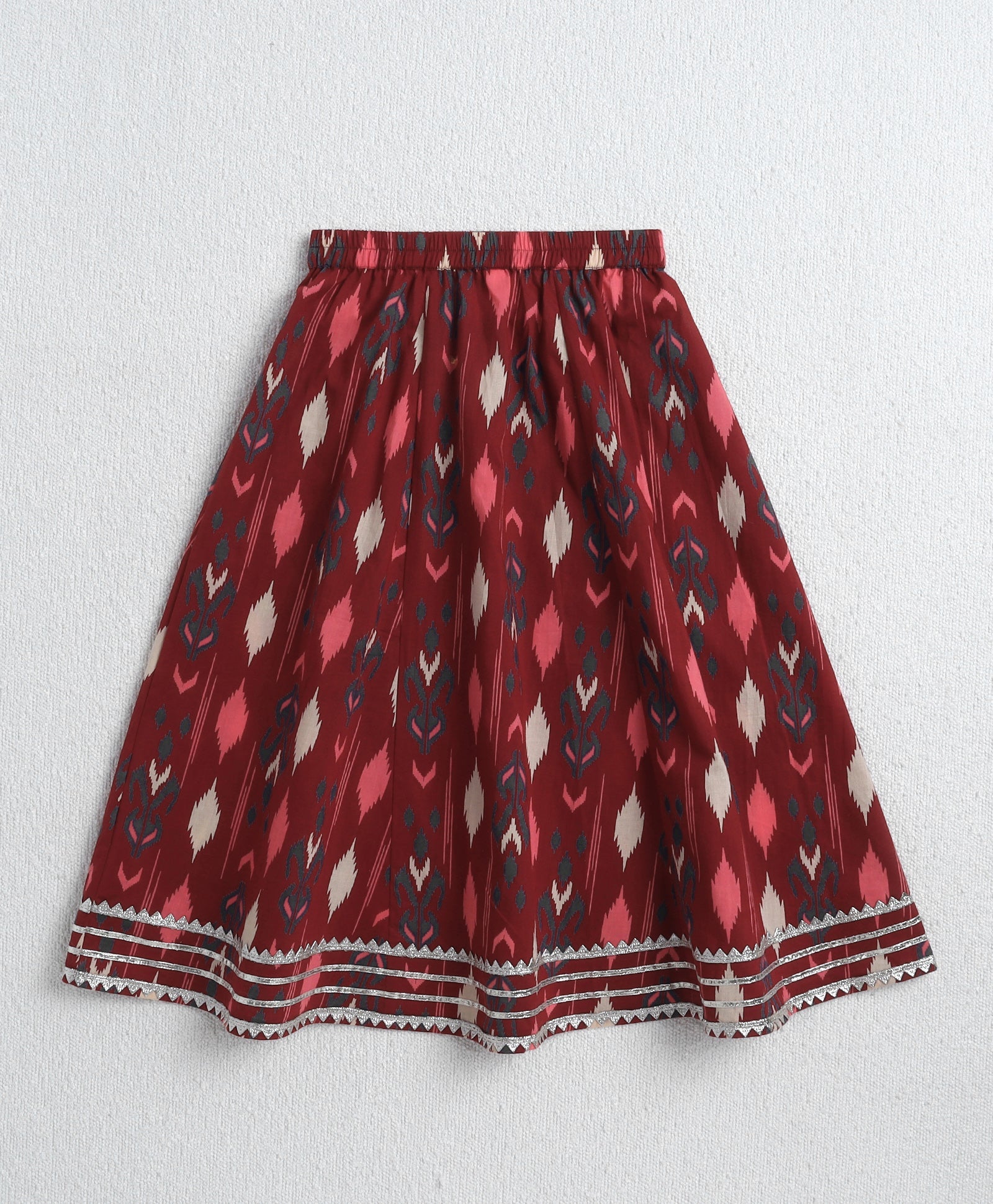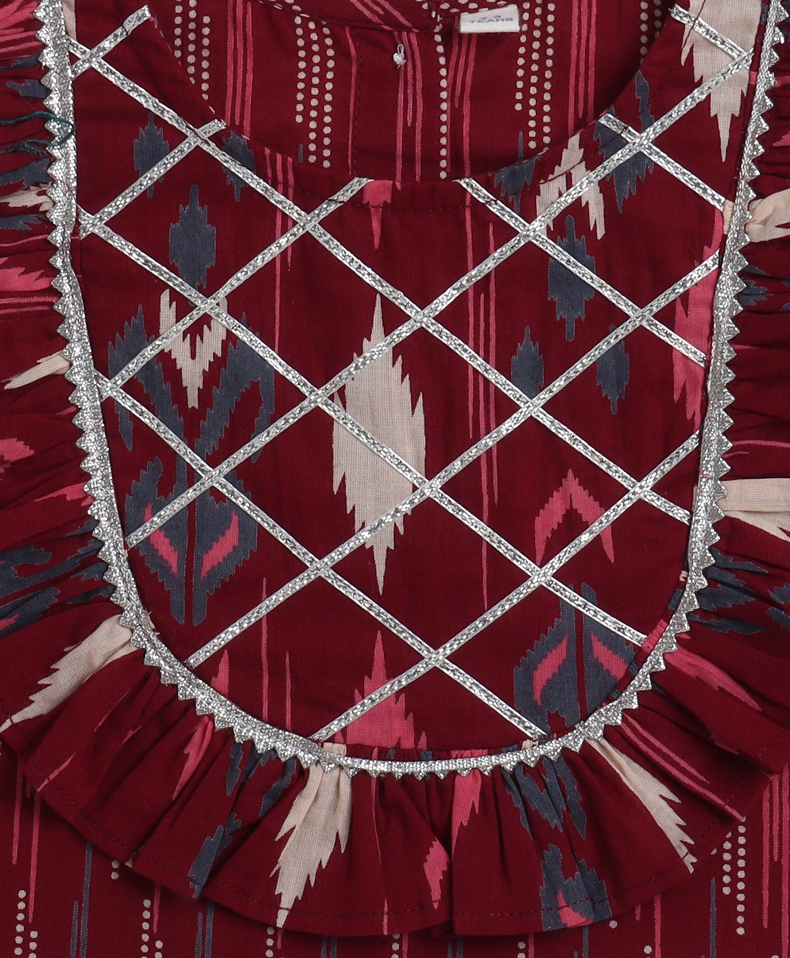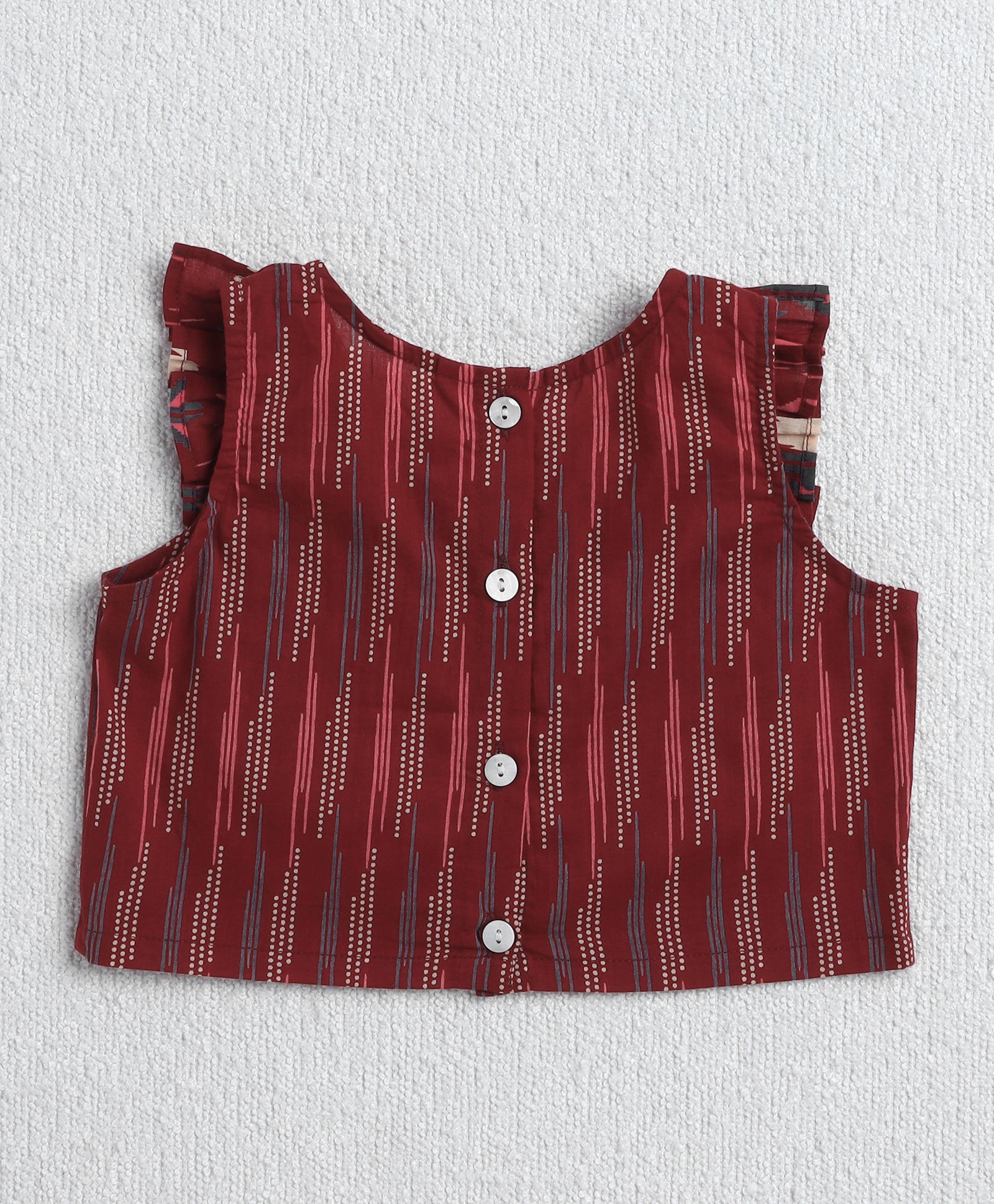 The Magic Wand Cambric Cotton Sleeveless Floral Printed Frill Choli and Lehenga Set- Maroon