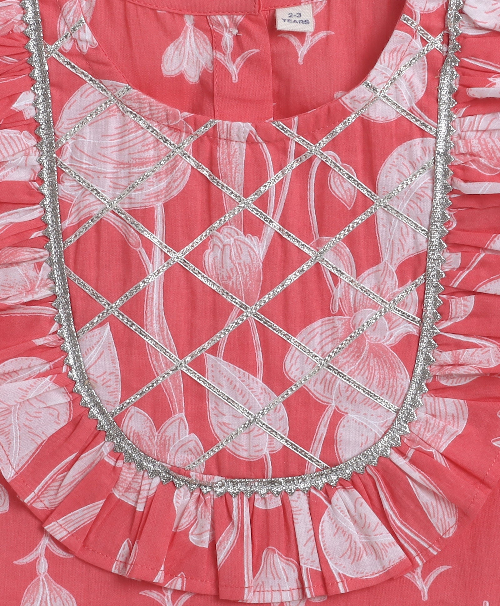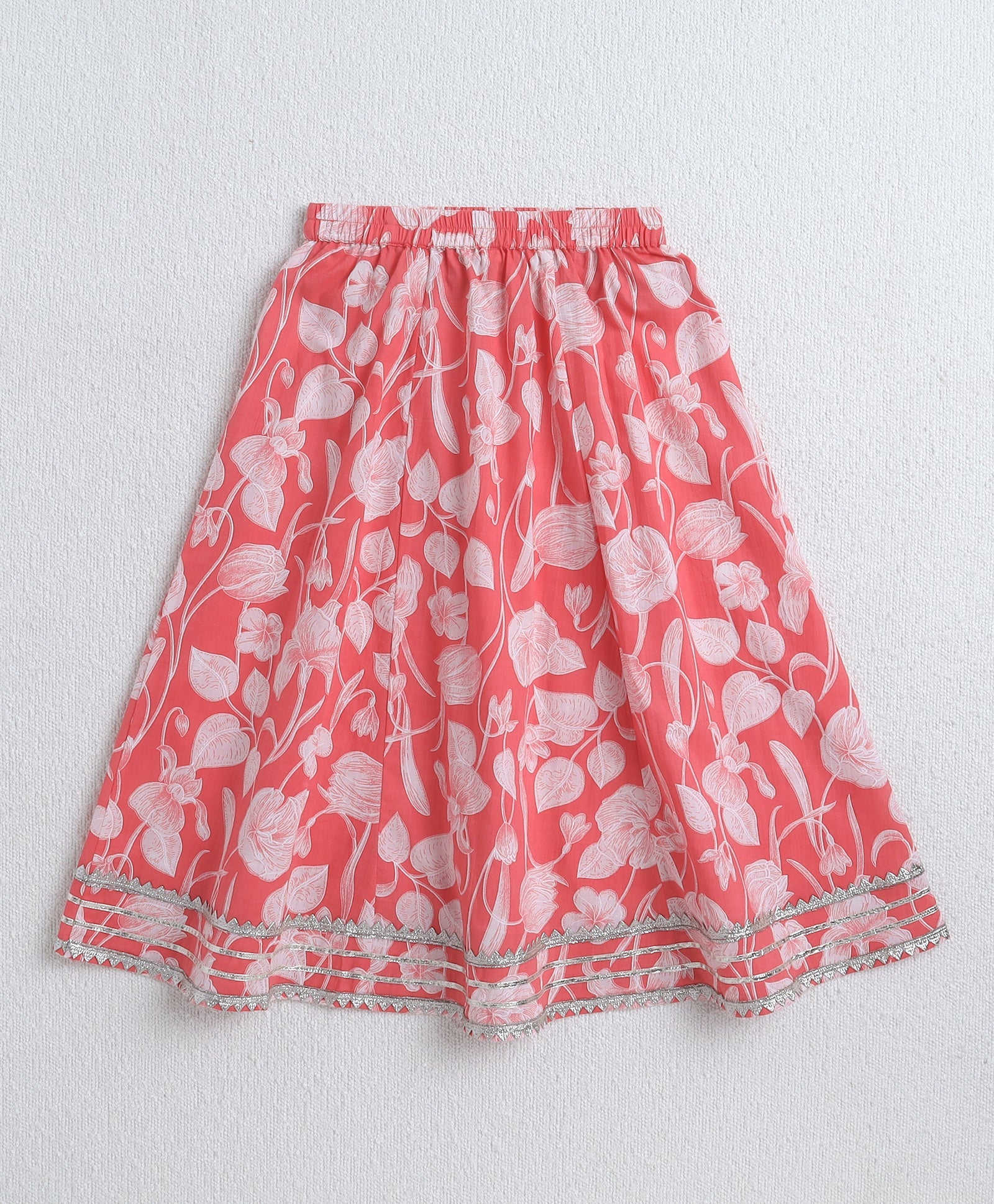 The Magic Wand Cambric Cotton Sleeveless Floral Printed Frill Choli and Lehenga Set- Peach