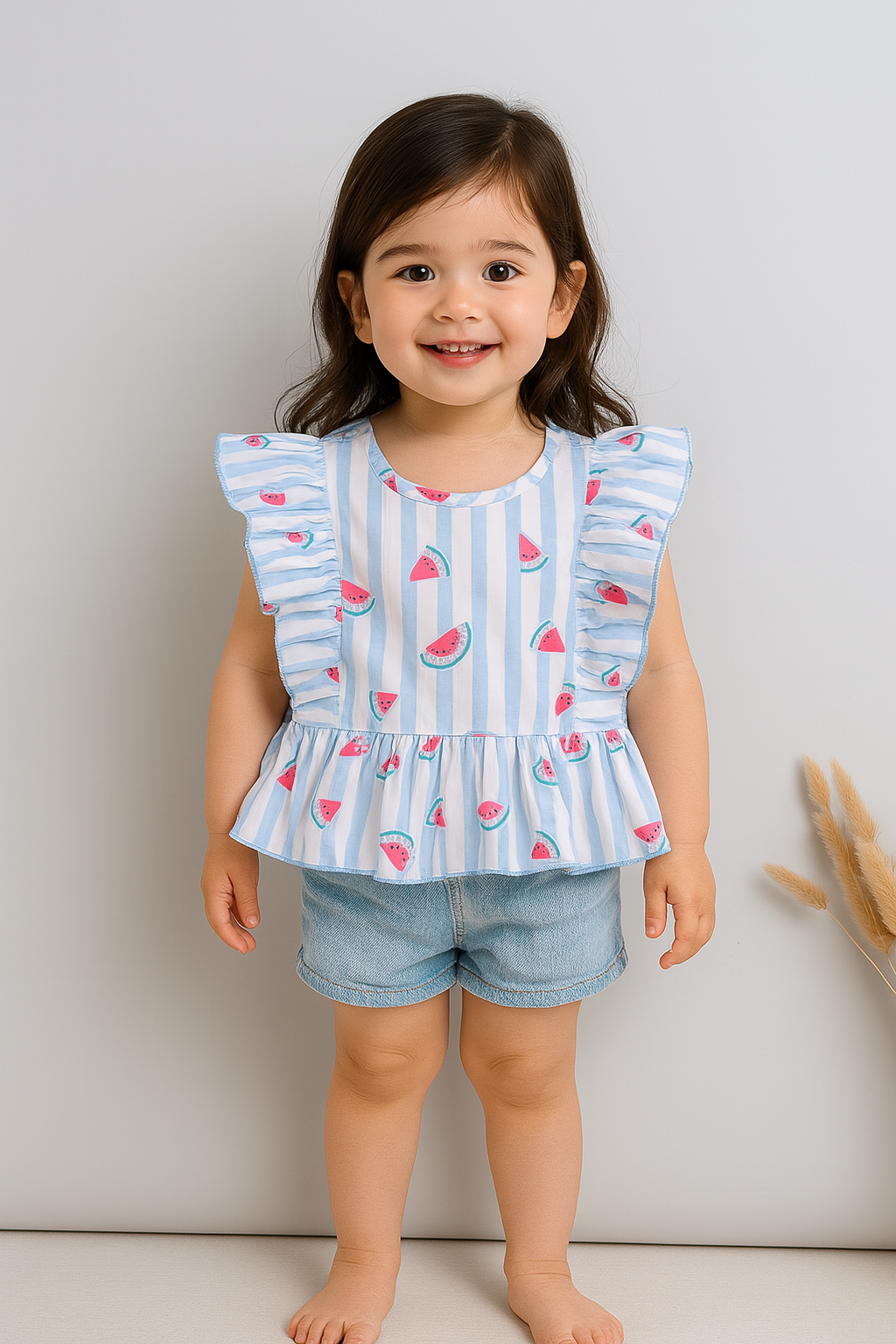 The Magic Wand Cotton Watermelon Printed Frill Top- Blue