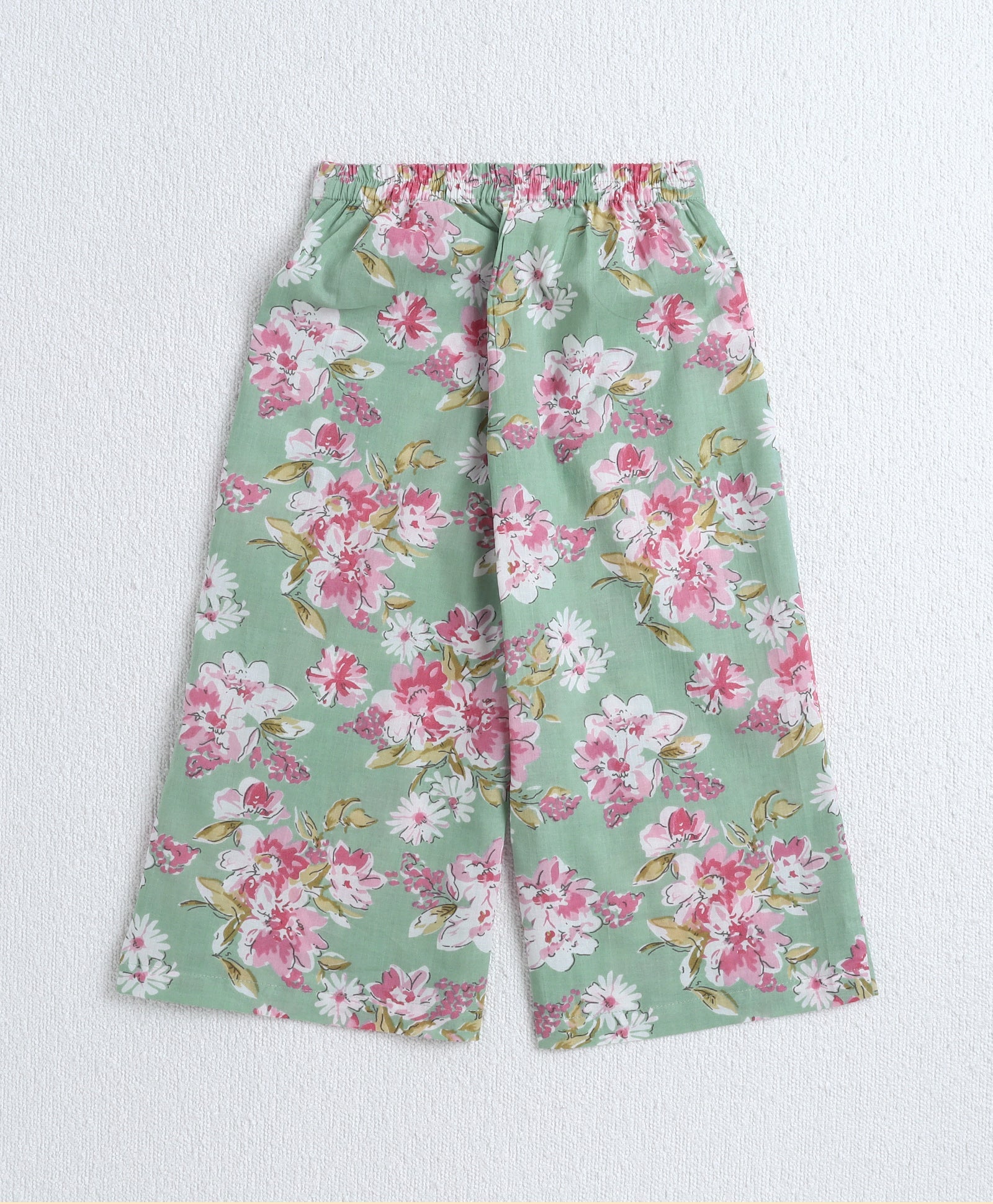 The Magic Wand Cotton Woven Ruffle Sleeves Floral Printed Top and Pant with Patch Pocket Set- Mint