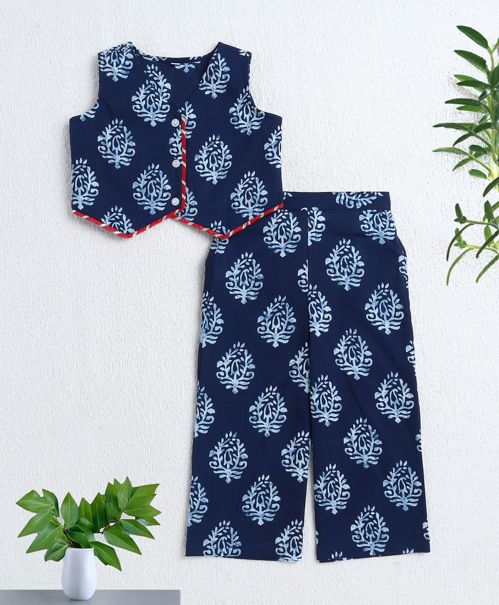 The Magic Wand Cotton Woven Sleeveless Floral Printed Top and Pant Set- Navy Blue