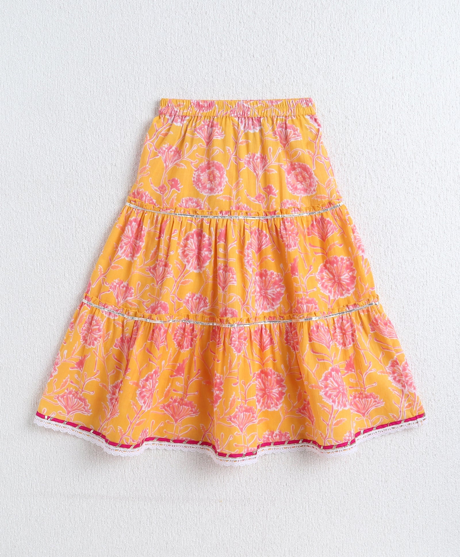 The Magic Wand Cotton Woven Sleveless Floral printed Lace Detailed Choli & Lehenga Set with Dupatta- Yellow