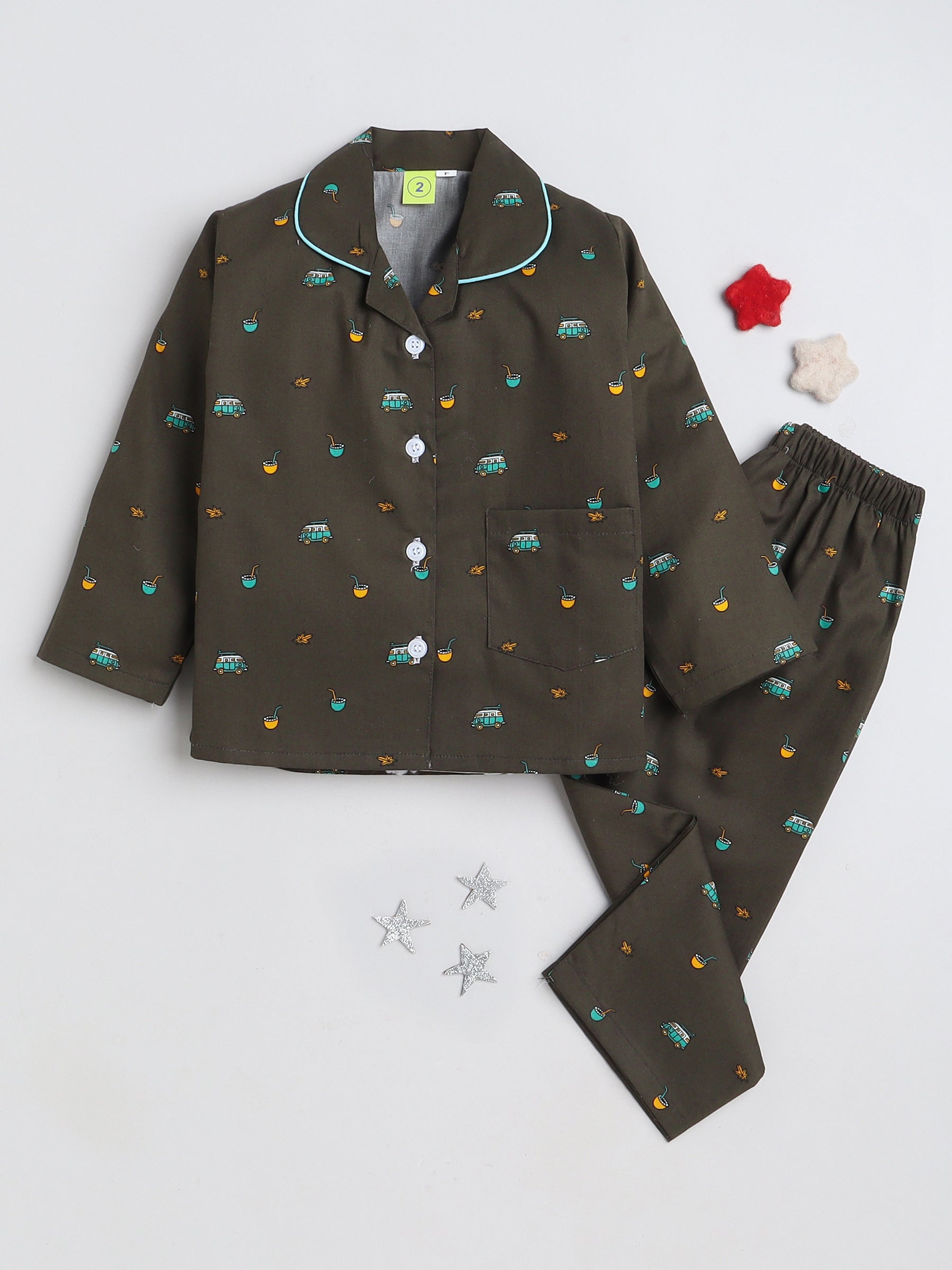 The Magic Wand Full Sleeves Vehicles Printed Lounge Wear Night Suit Set For Kids Olive