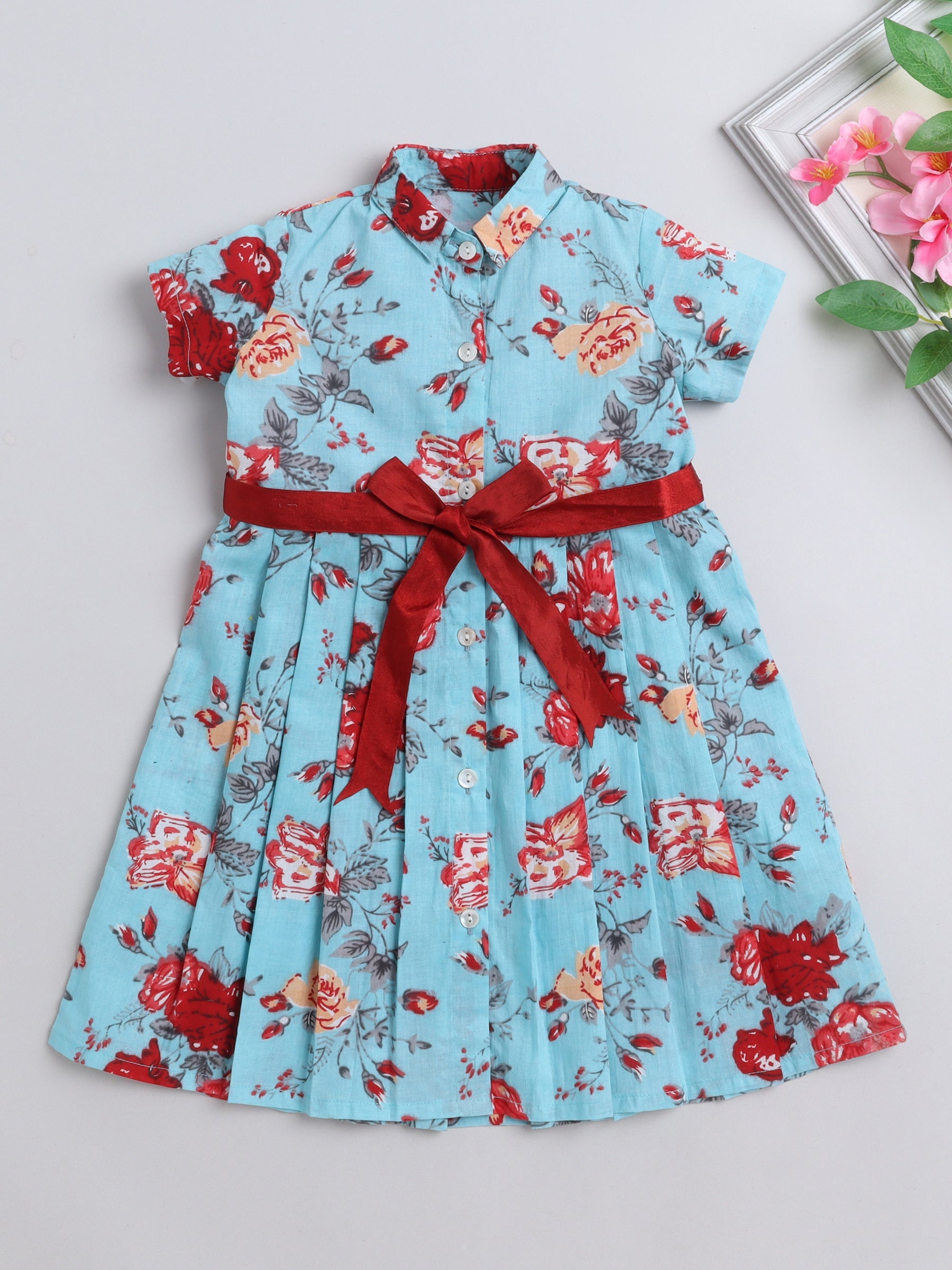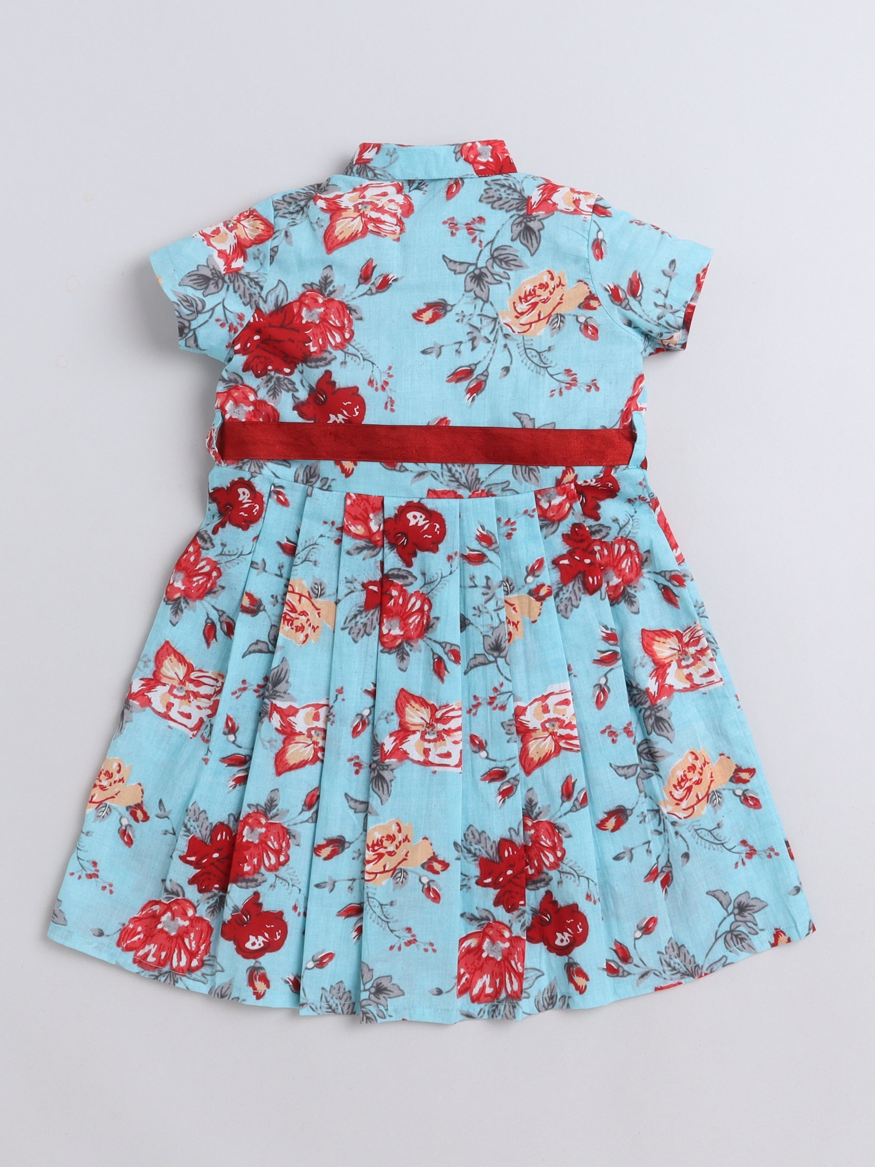 The Magic Wand Half Sleeves Floral Printed Collar Neck Dress With Belt Detailed For Girls Blue