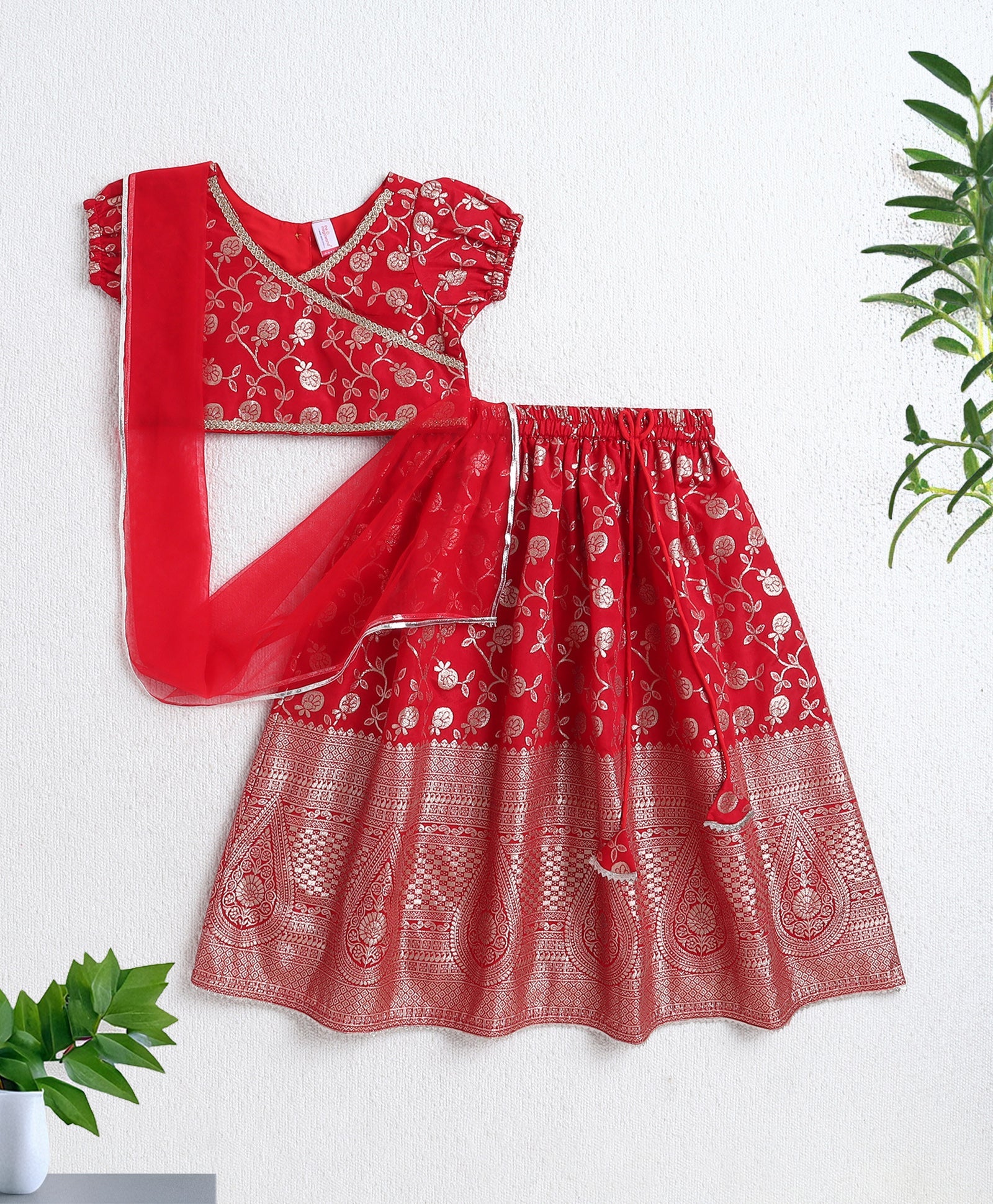 The Magic Wand Jacquard Woven Puff Sleeves Leaves Foil Printed & Gota Lace Embellished Choli Lehenga With Dupatta Set- Red