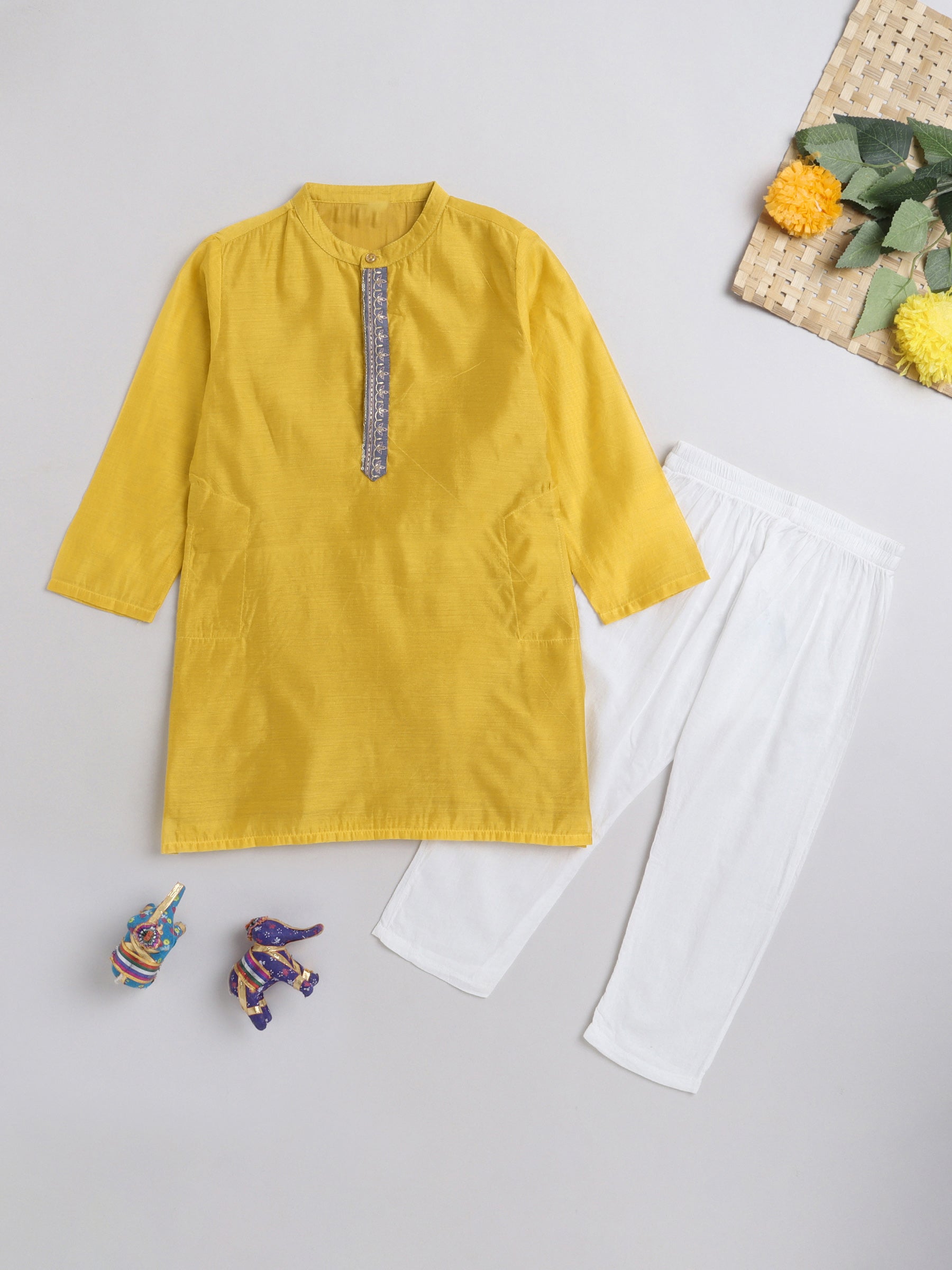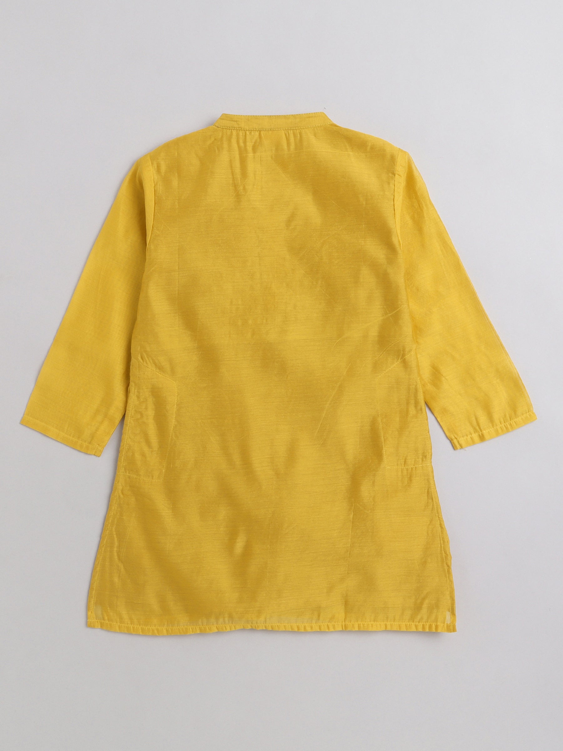 The Magic Wand Mandarin Collar Full Sleeves Lace Embelished Kurta and Pant Set For Boys-Mustard