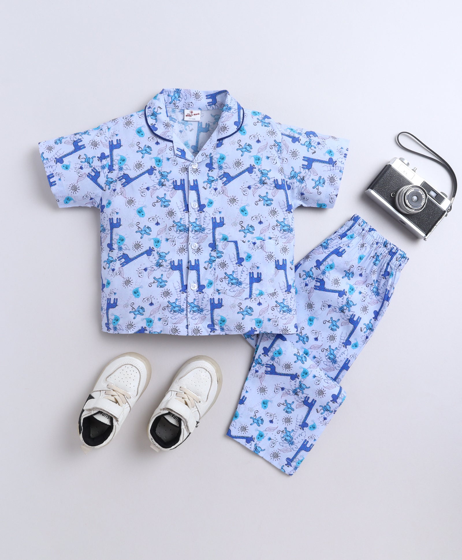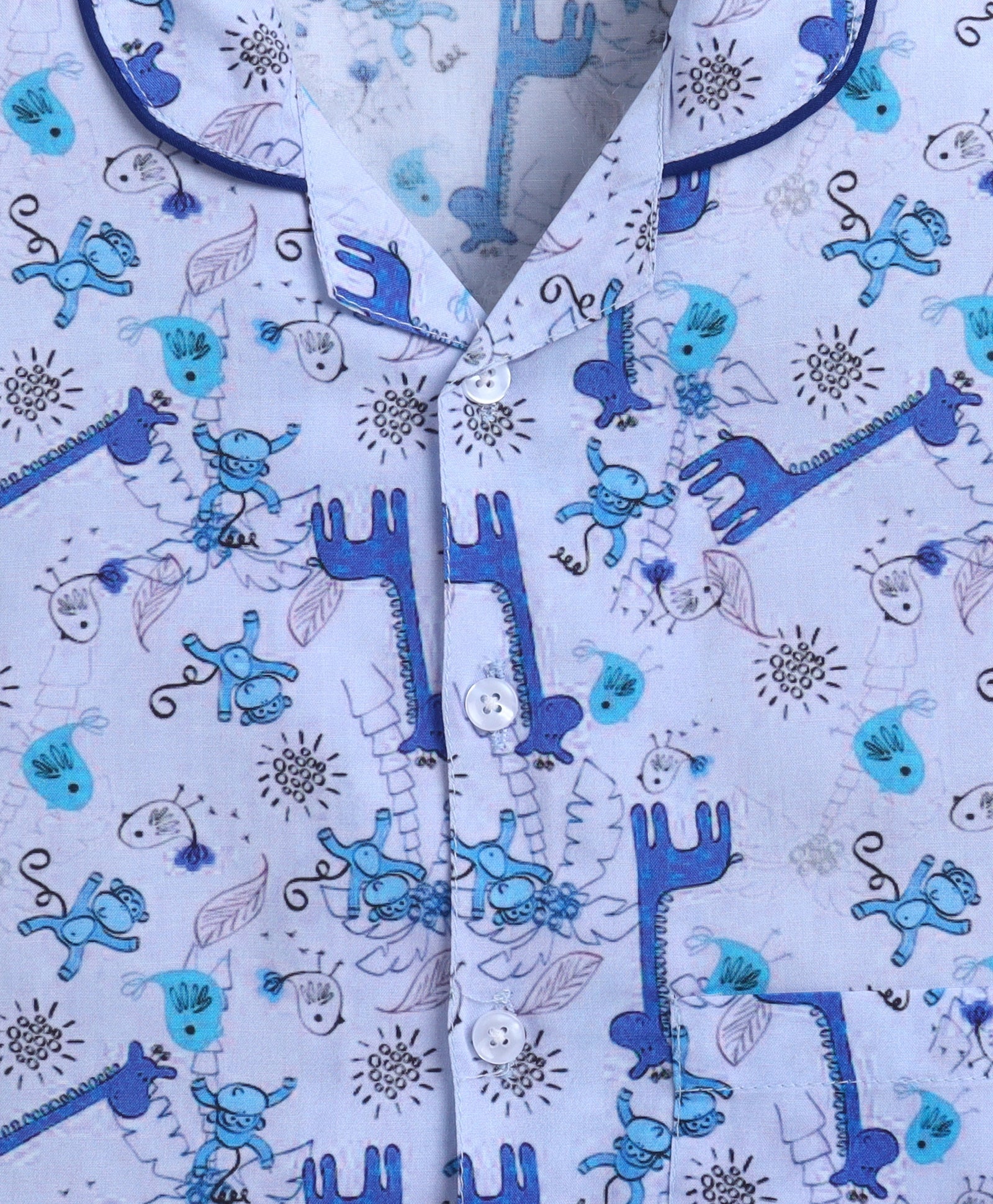The Magic Wand Poplin Cotton Half Sleeves Animal Printed Night Suit Set- Blue
