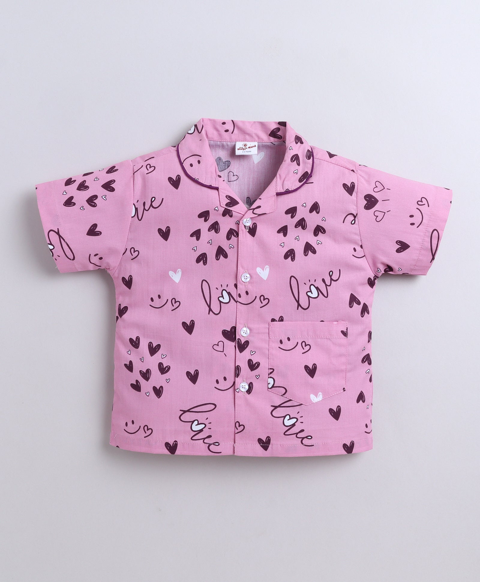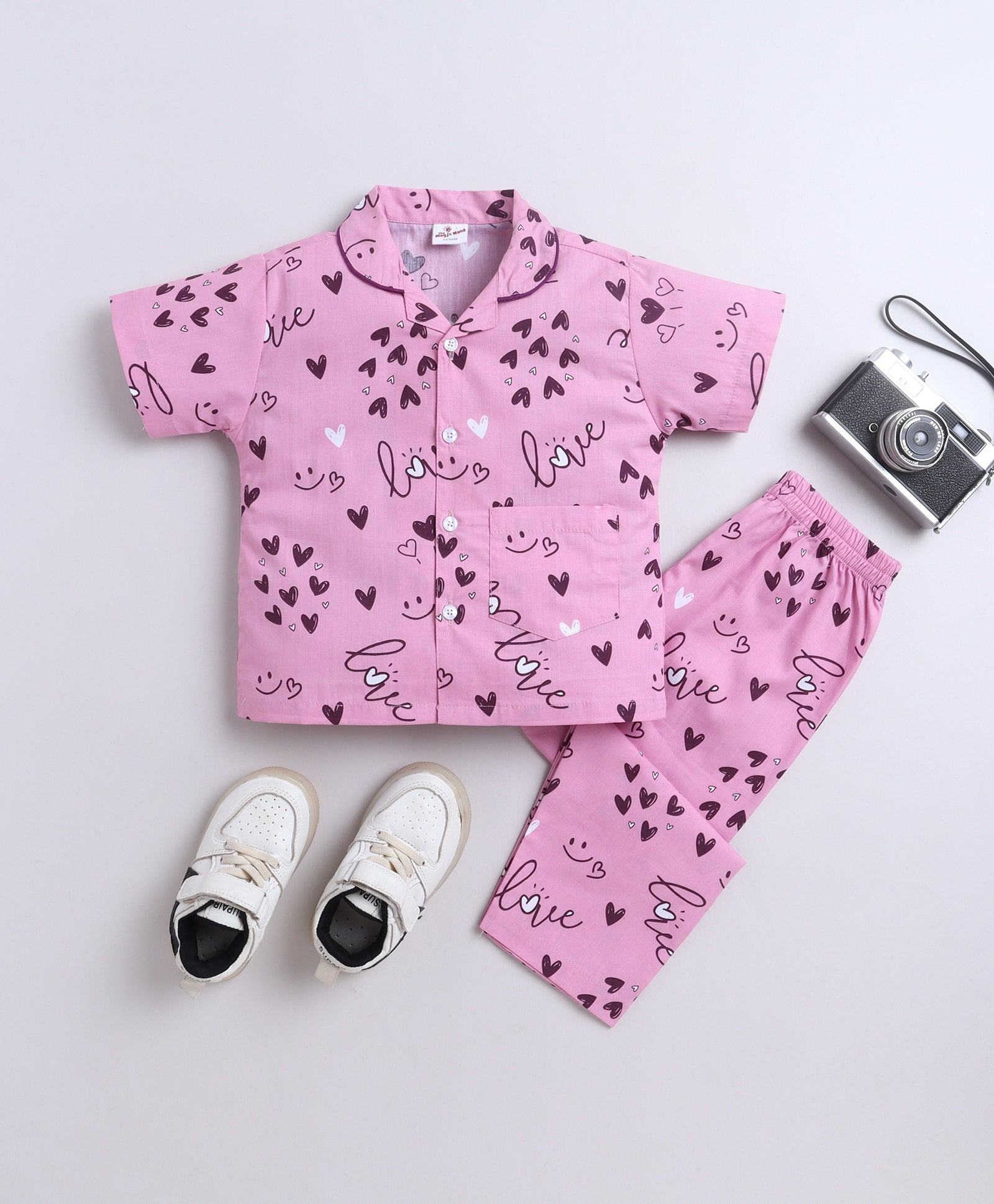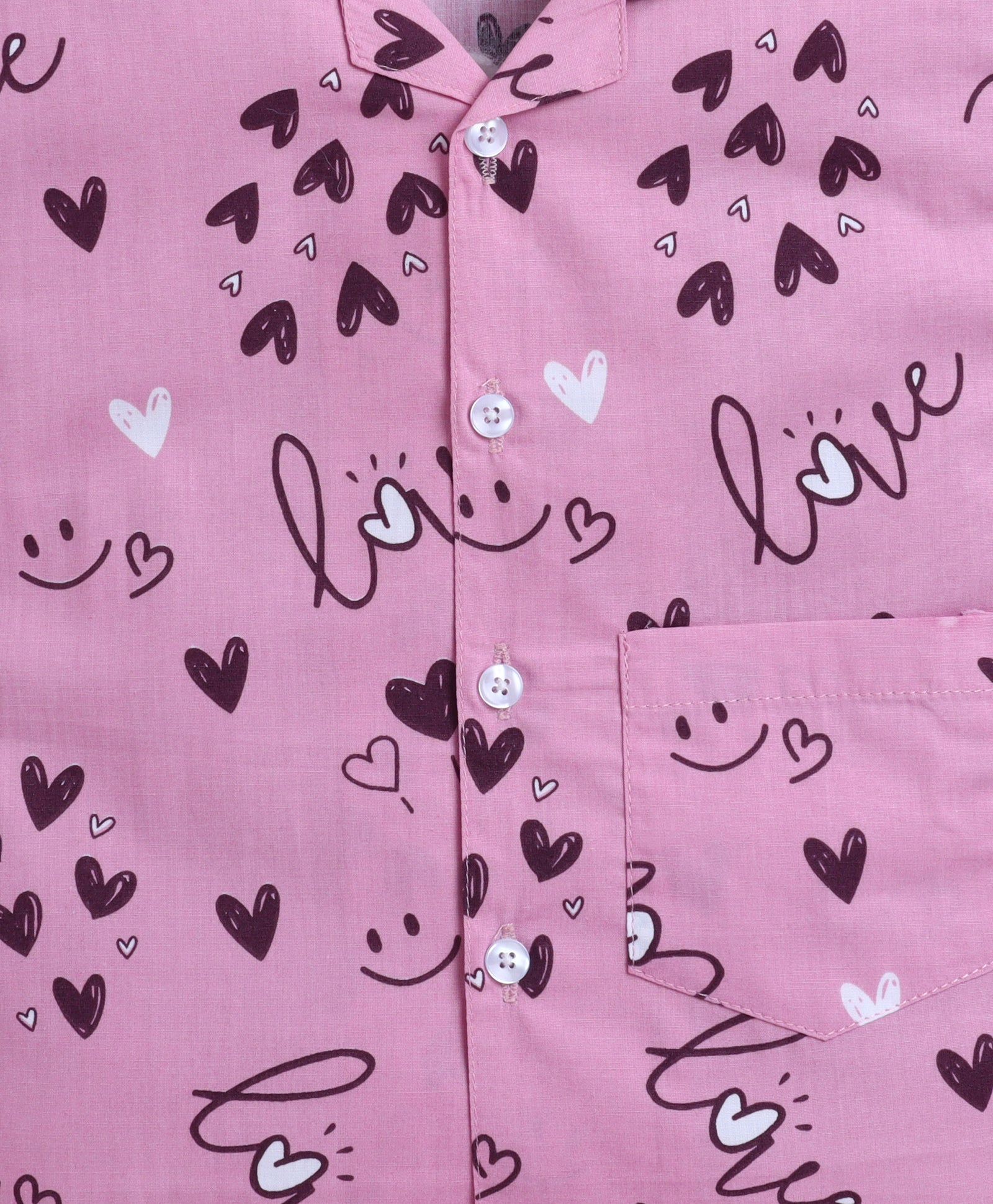 The Magic Wand Poplin Cotton Half Sleeves Heart Printed Night Suit Set- Pink