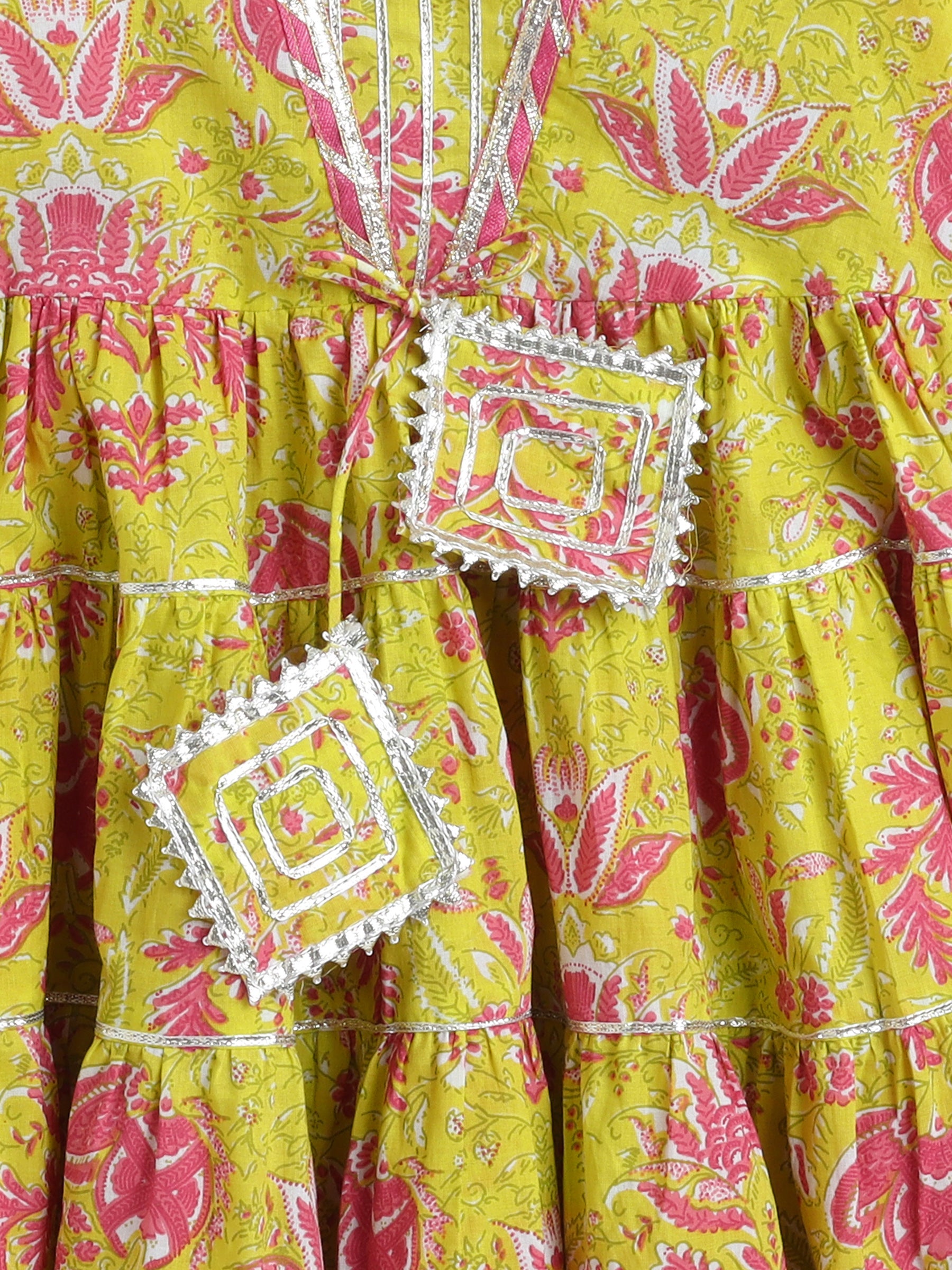 The Magic Wand Printed Short Sleeves Gora Lace & Tassle Detailing Tiered Gota Dress For Girls