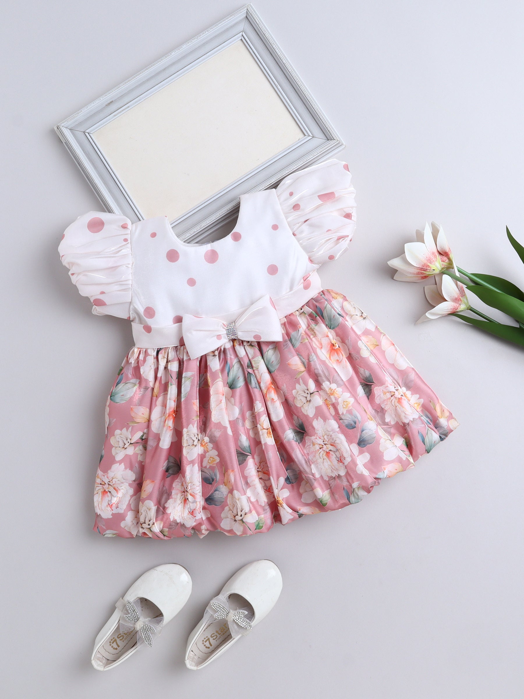 The Magic Wand Puff Sleeves Bow Applique Floral Printed Dress - Onion Pink