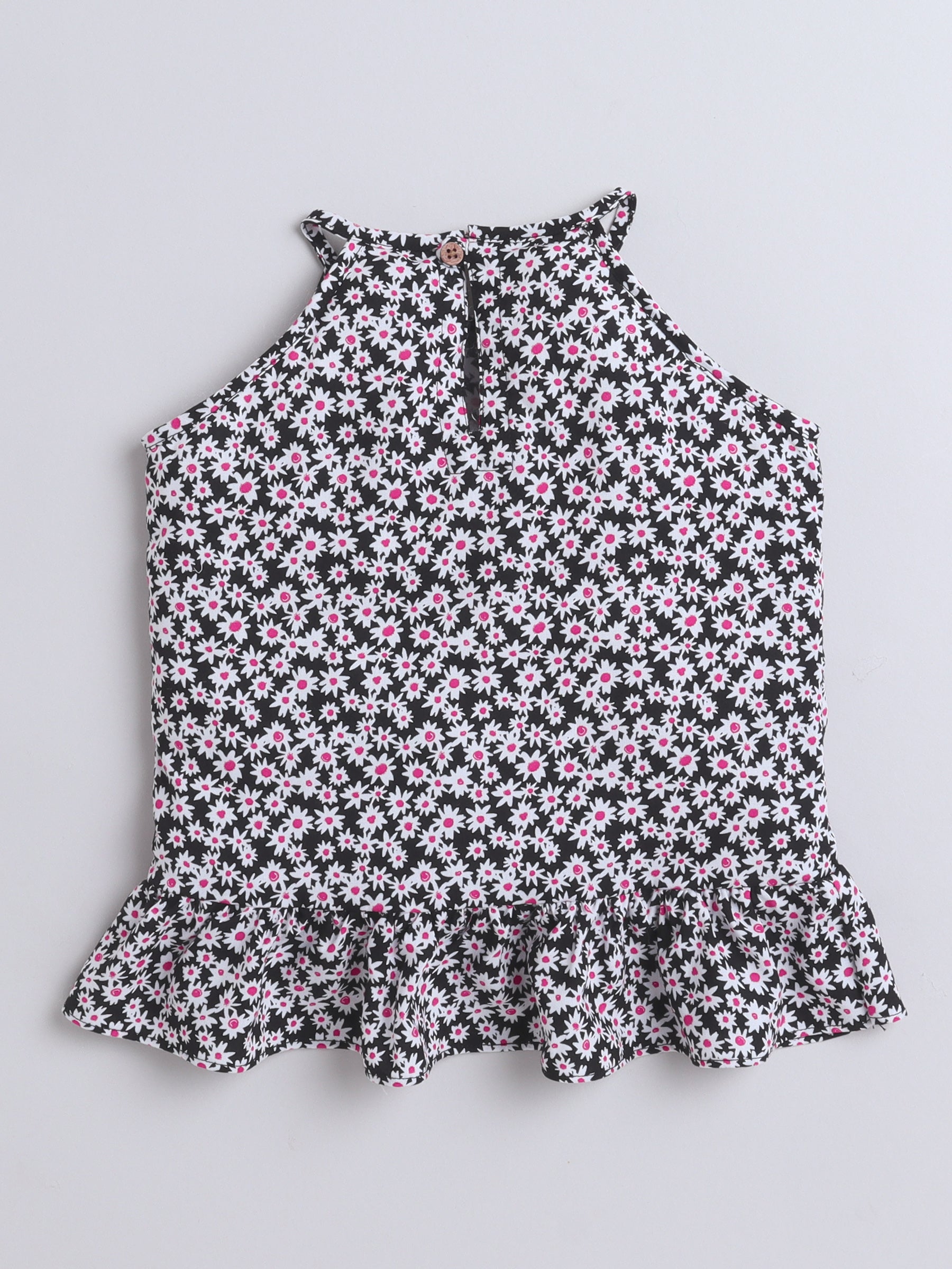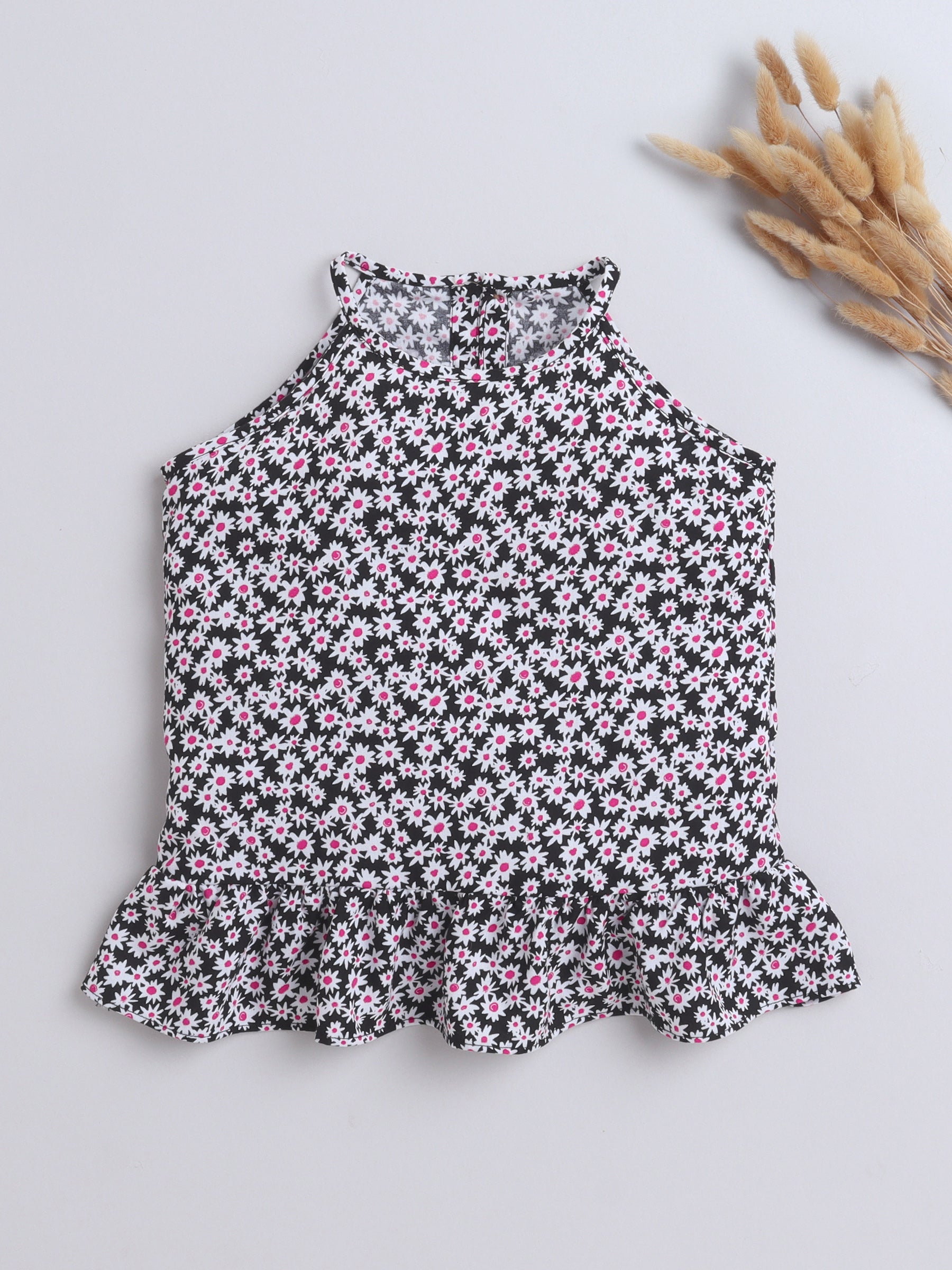 Rayon Floral Printed Frill Detailed Incut Top-Black