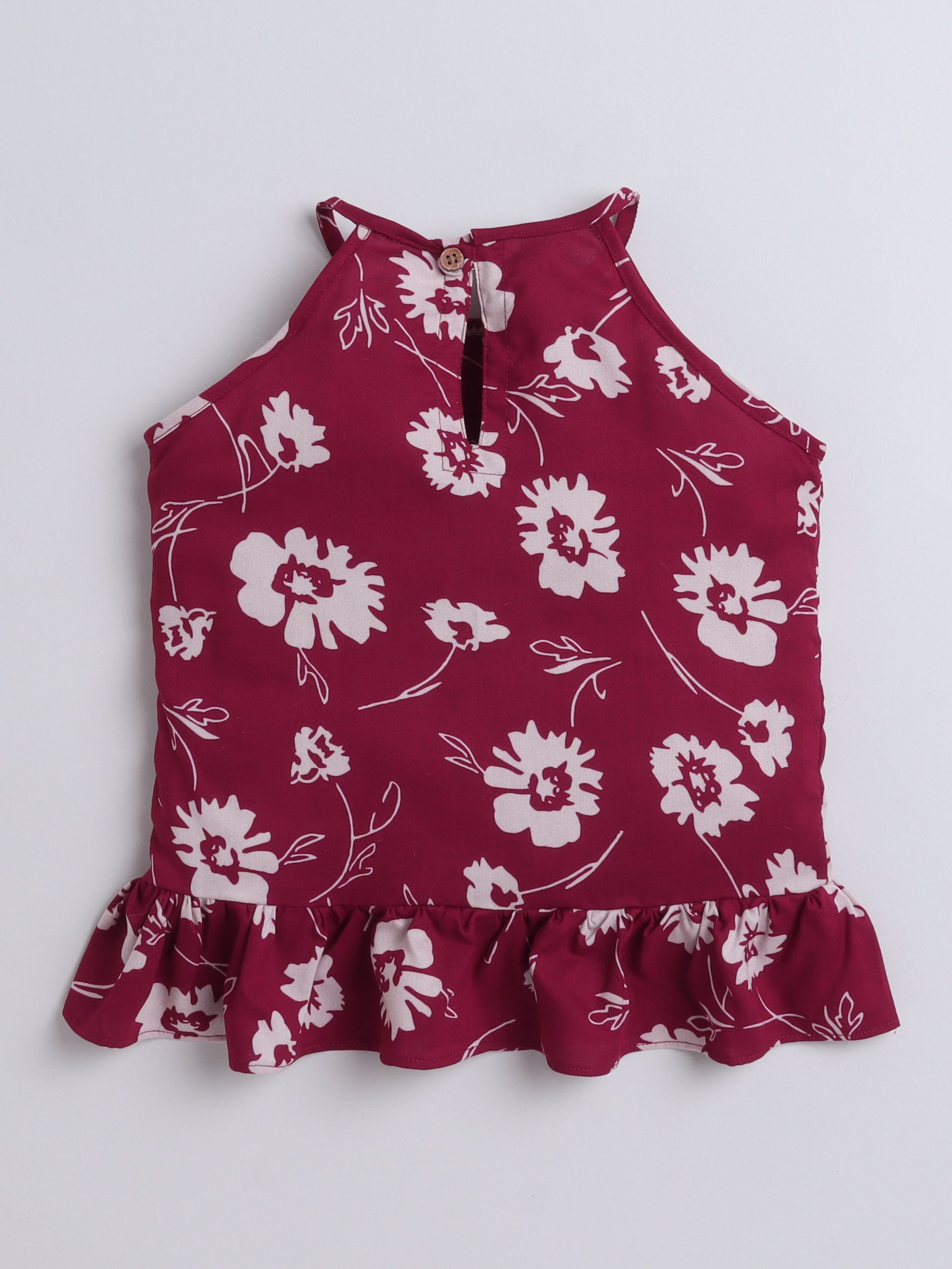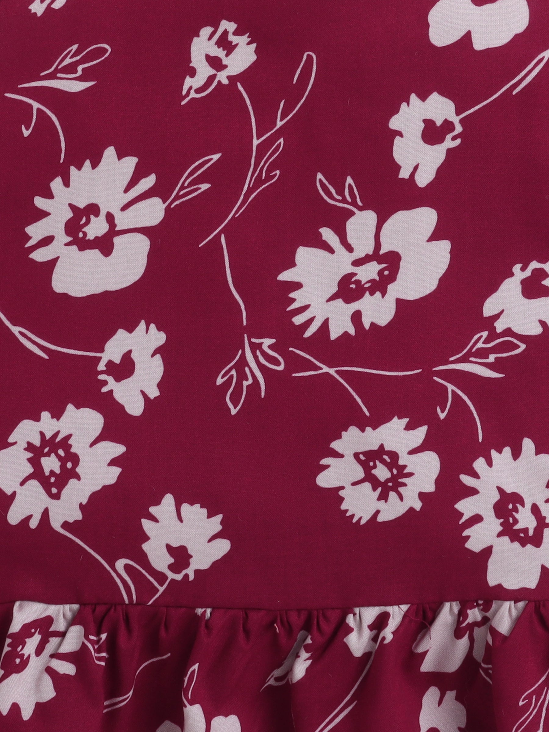 The Magic Wand Rayon Floral Printed Frill Detailed Incut Top Maroon