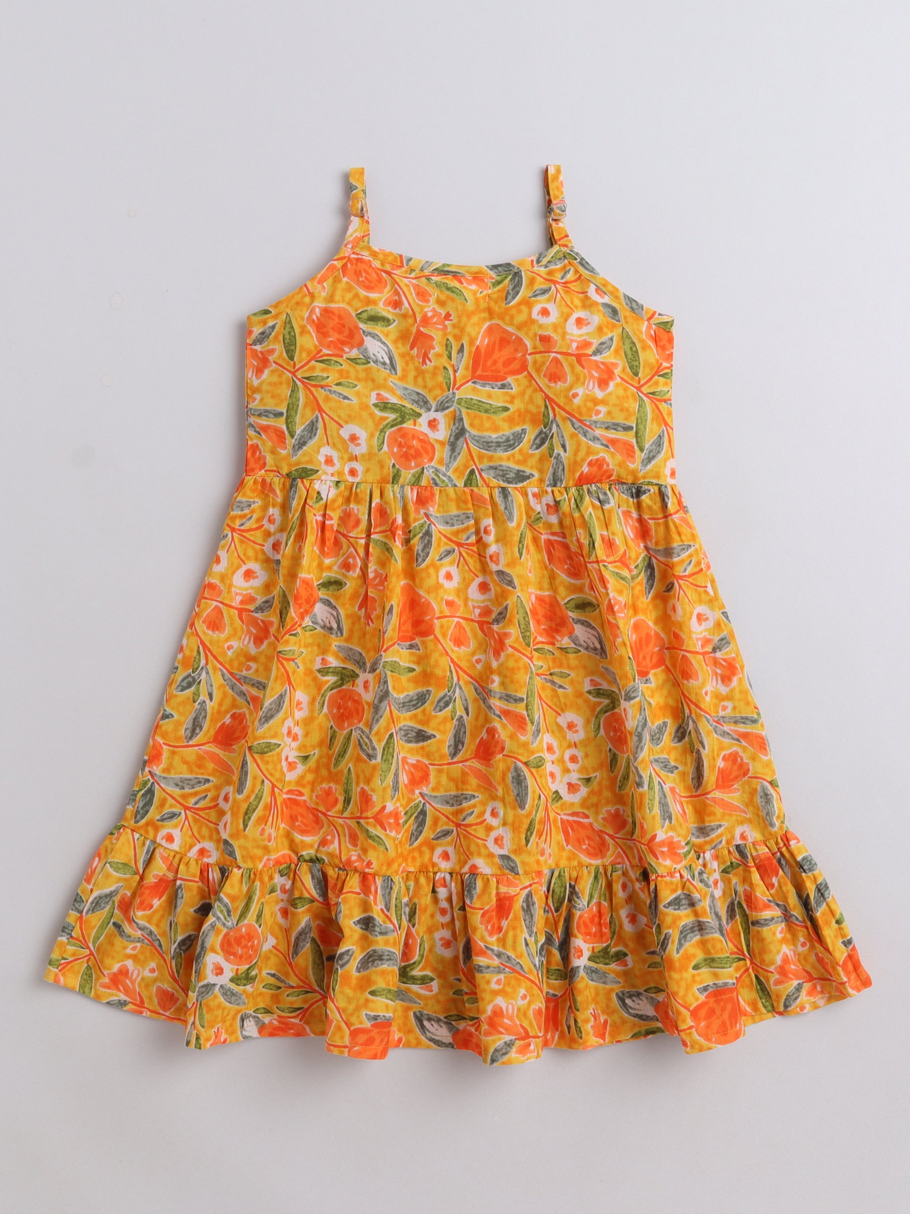 The Magic Wand Singlet Floral Printed Cotton Sustainable Sleeveless Strappy Tiered Dress - Mustard
