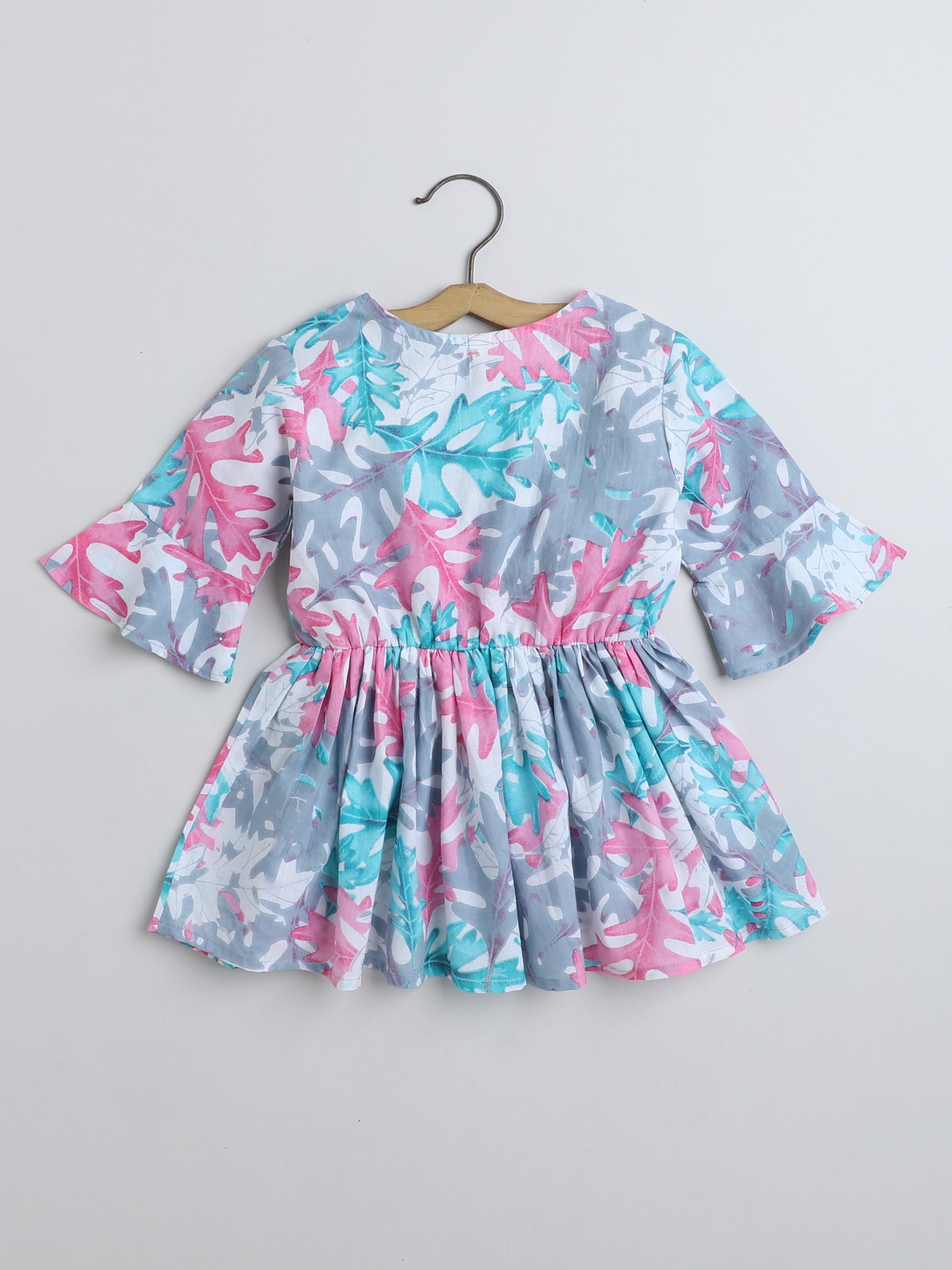 Three Fouth Sleeves Gathered Leaf Printed Top with Tassels-Blue