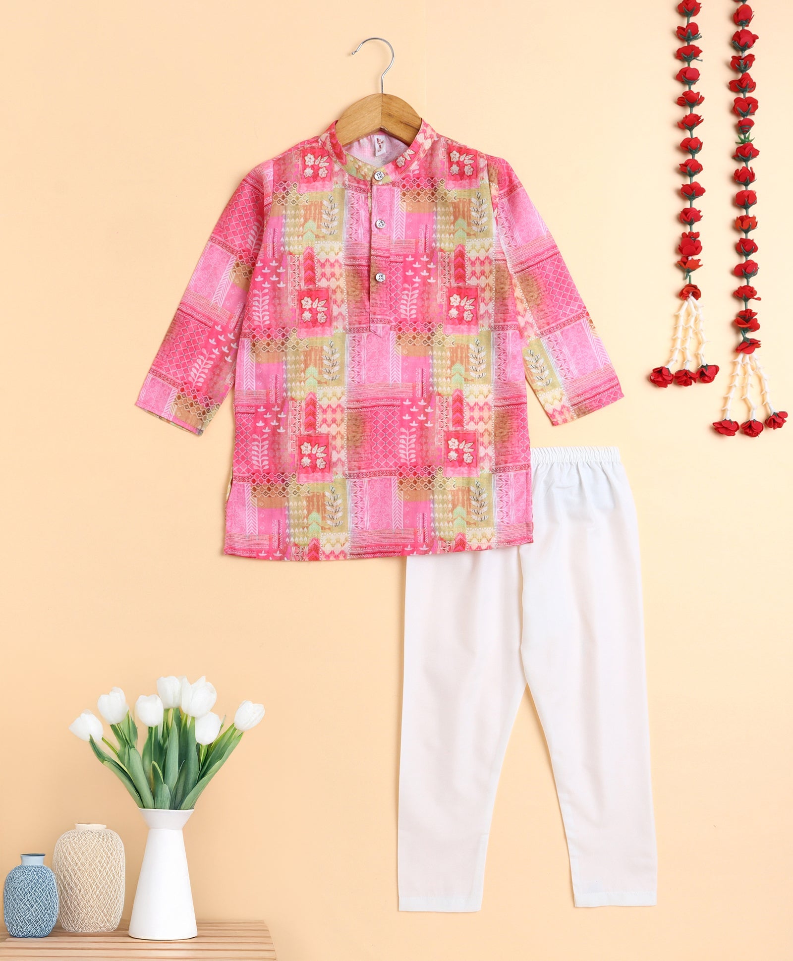 The Magic Wand Woven All Over Printed Full Sleeves Kurta with Pyjama Set - Pink