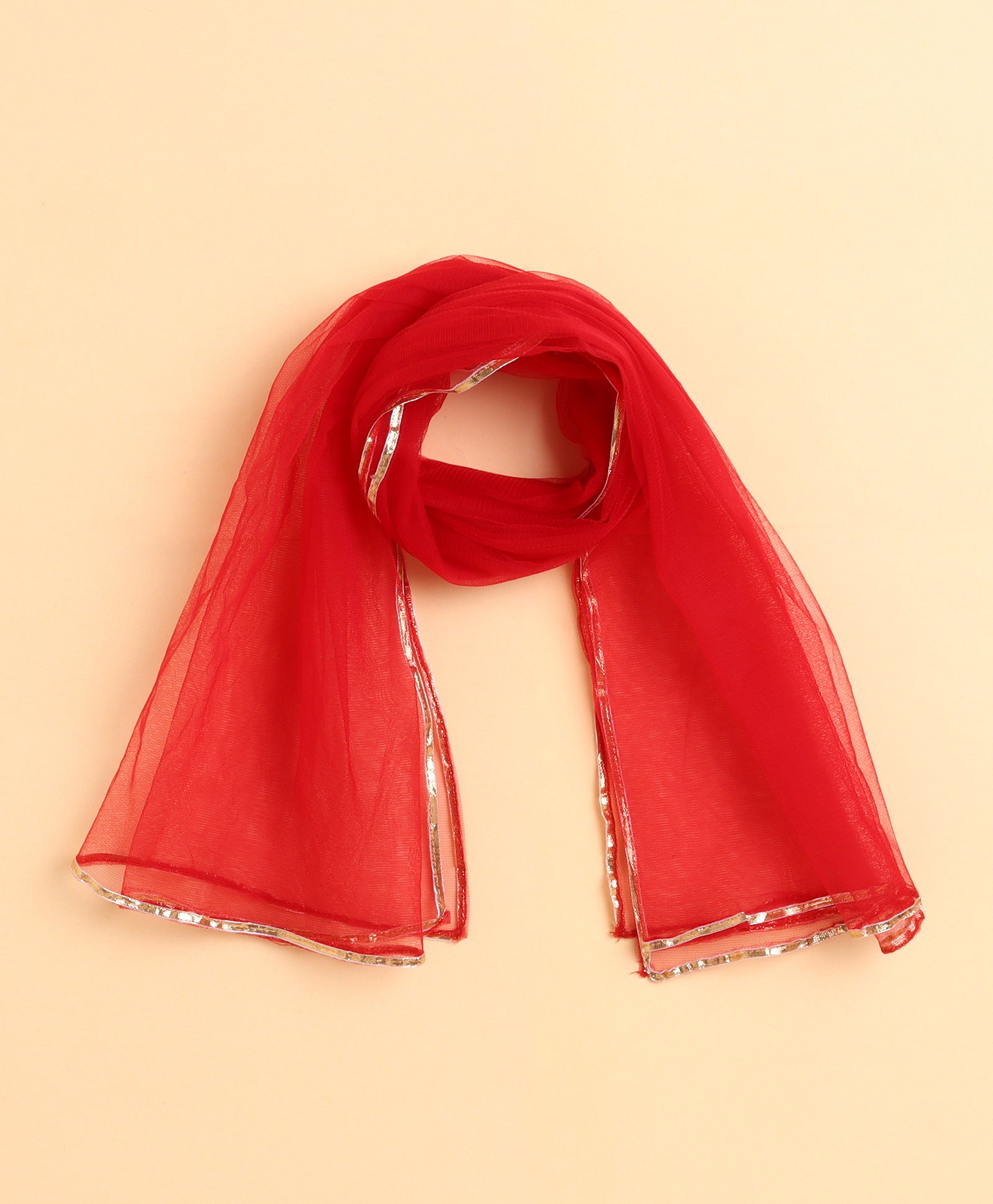 The Magic Wand Woven Half Sleeves Foil Printed & Lace Embellished Lehenga Choli With Dupatta Set - Red