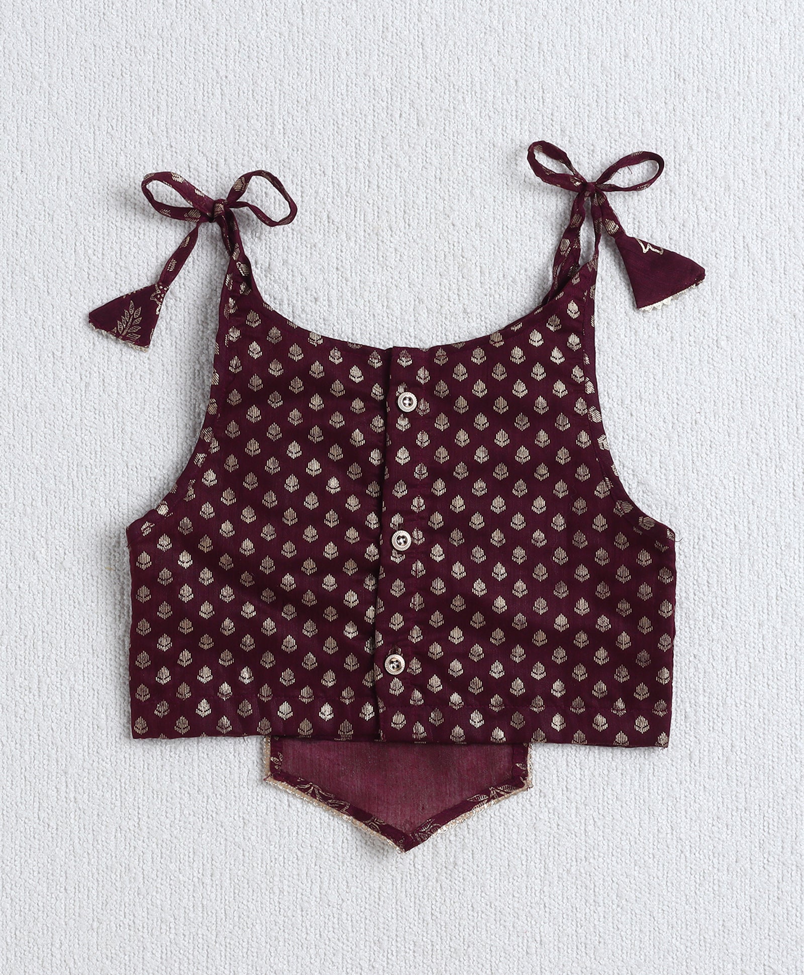 The Magic Wand Woven Shoulder Tie Up Foil Printed Trendy Long Yoke Choli with Lehenga Set with Dupatta- Wine