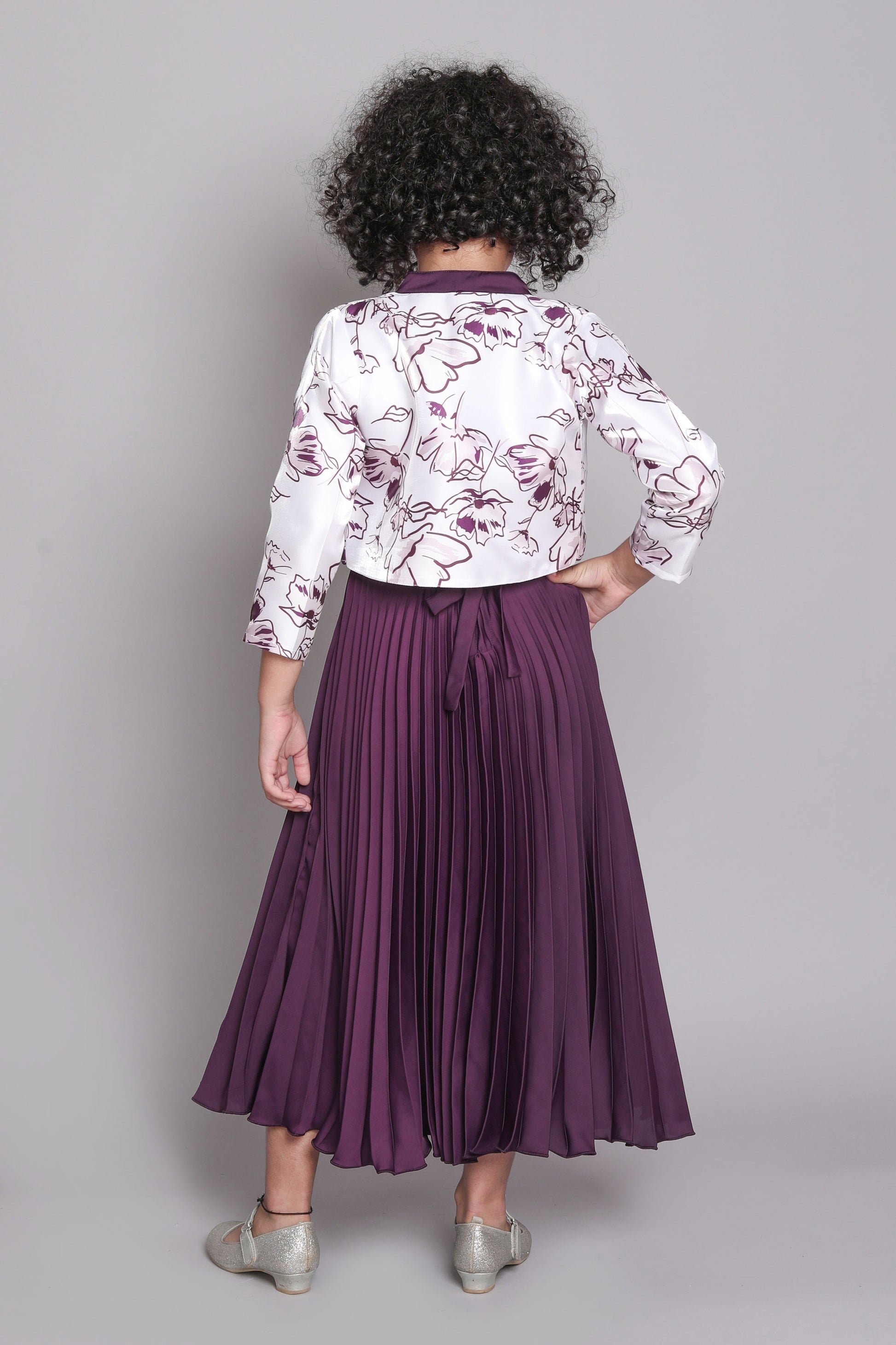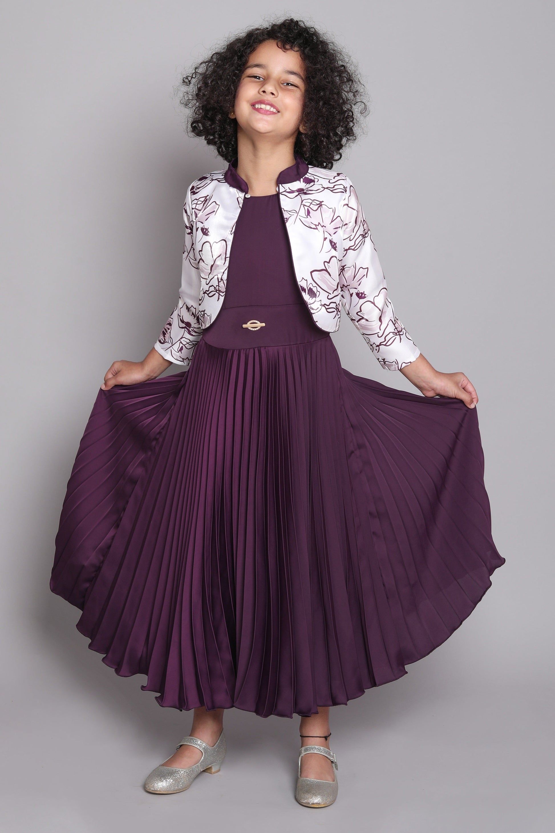 Three Fourth Sleeves Abstract Floral Printed Shrug With Accordion Pleated Fit & Flare Party Gown - Magenta Purple