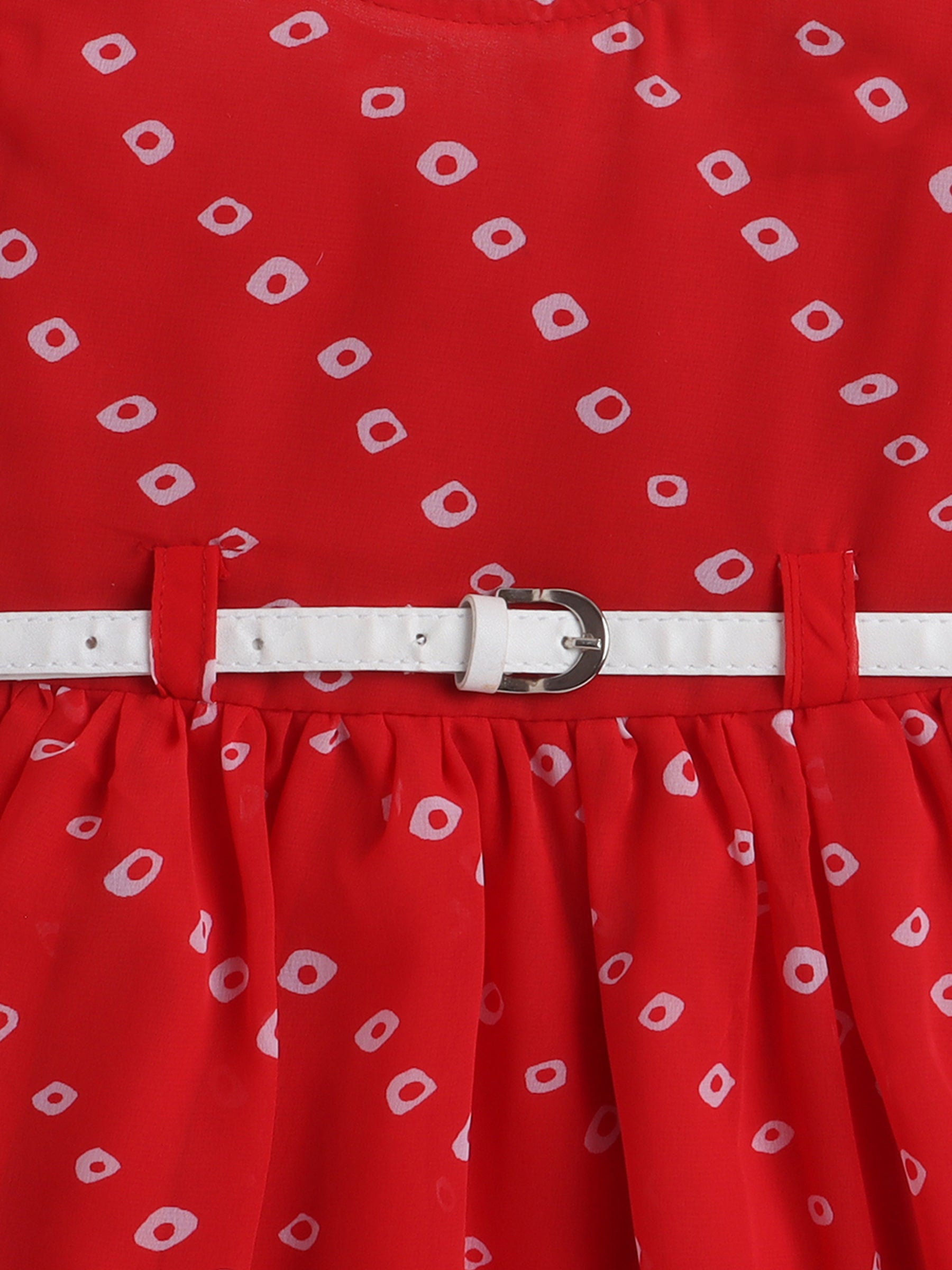 Xmas Square Dots Printed Cap Sleeves Dress With Contrast Belt For Girls-Red
